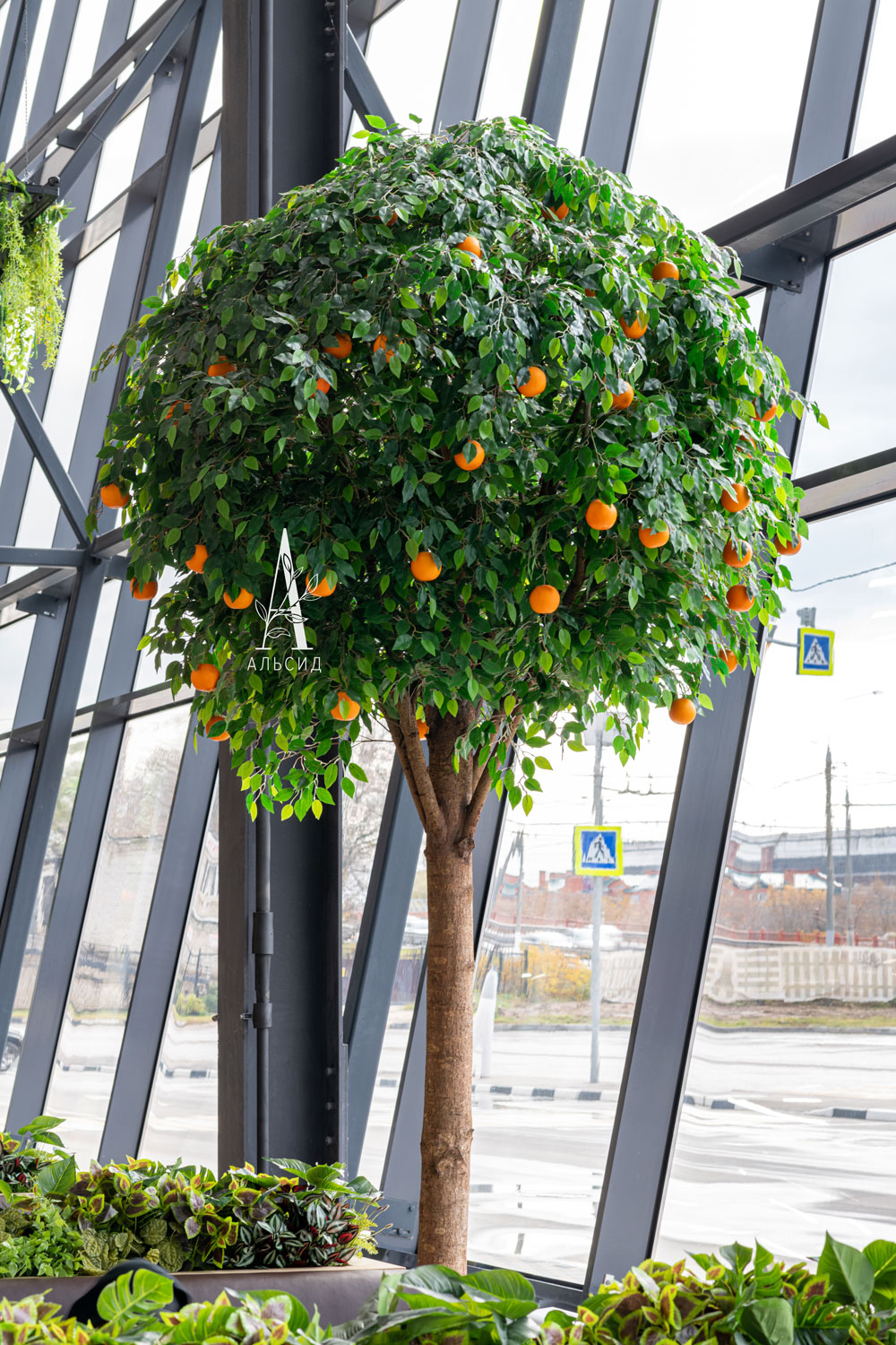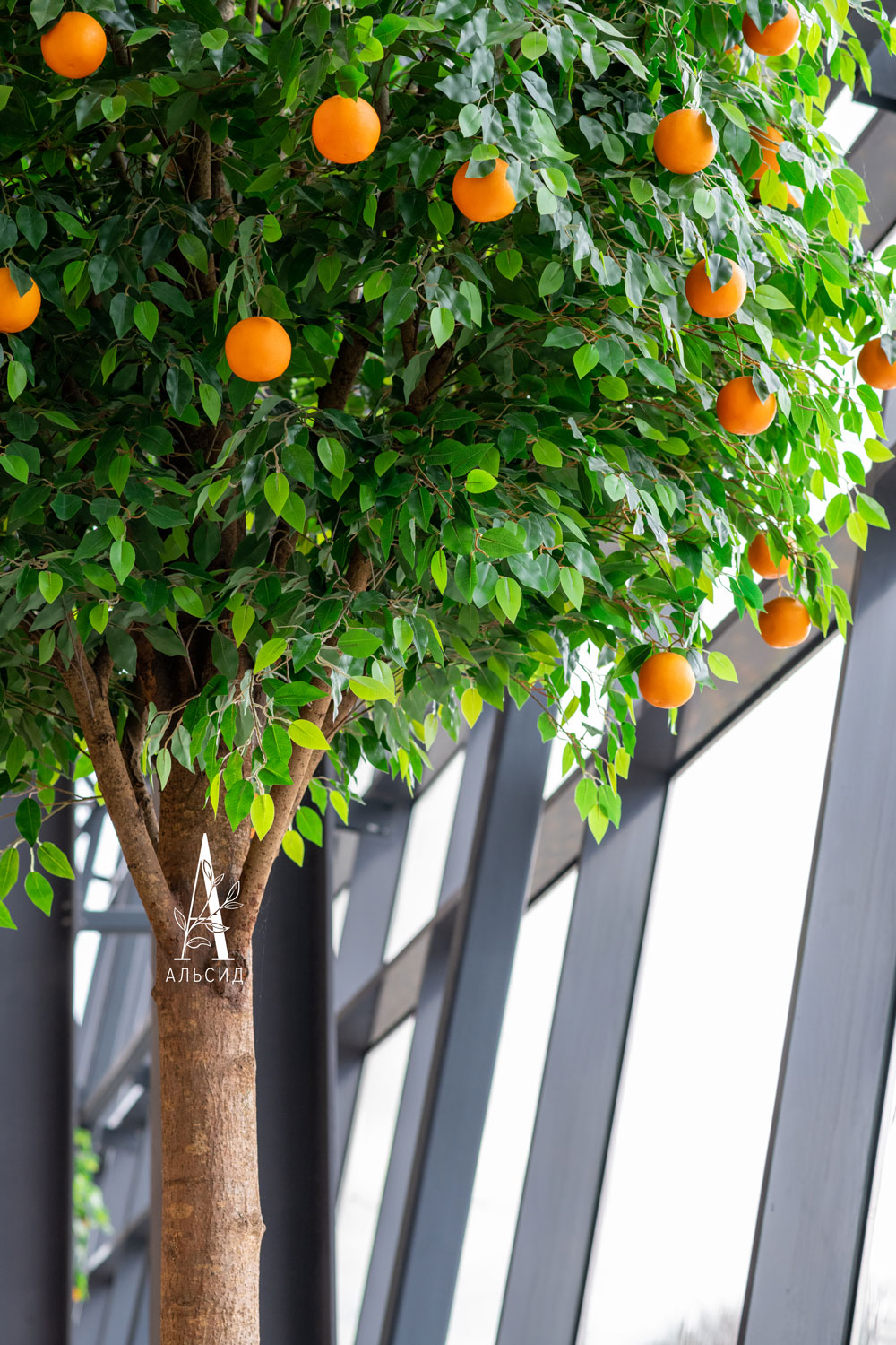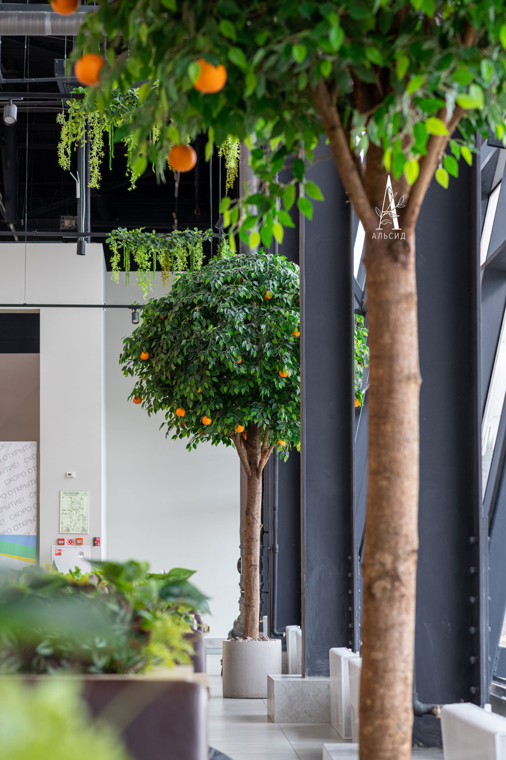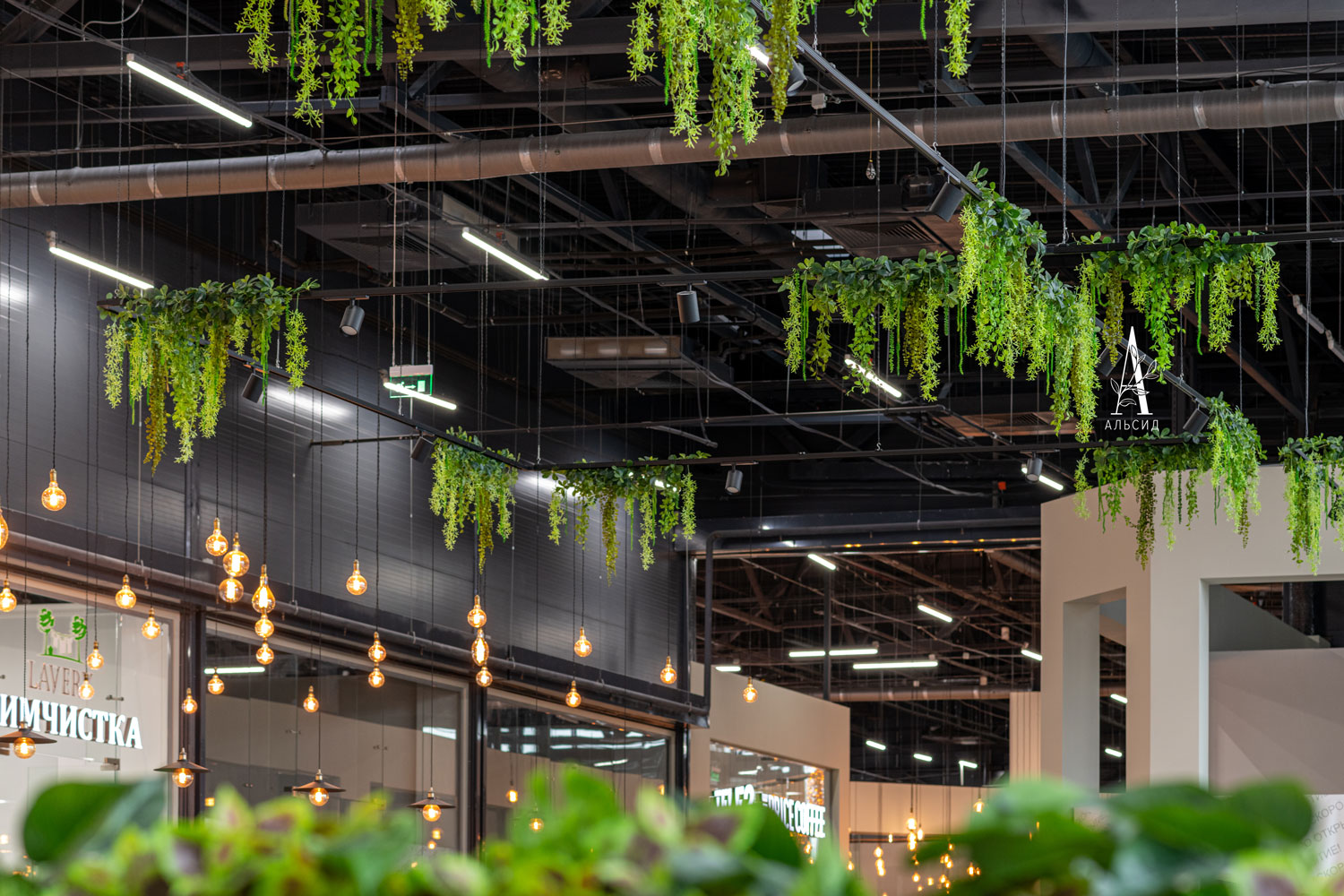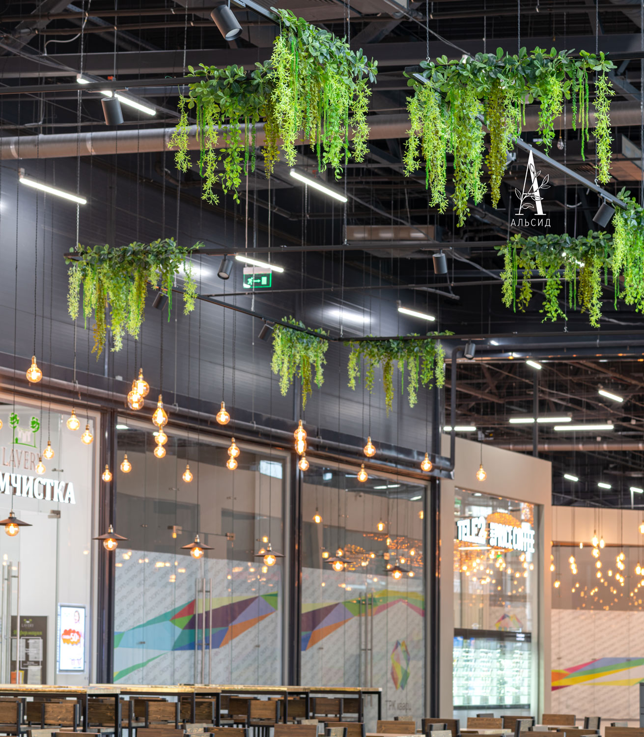 Использование искусственных растений и деревьев в торговых центрах и фудкортах стало уже классическим оформлением: высокие шеффлеры и фикусы на натуральных стволах отлично подходят для зон отдыха, а апельсиновое дерево - идеально для фудкорта. Ампельные растения, как правило, располагаются на потолочных светильниках, а боксы с разнообразными растениями - между столиками, тем самым зонируя пространство.;