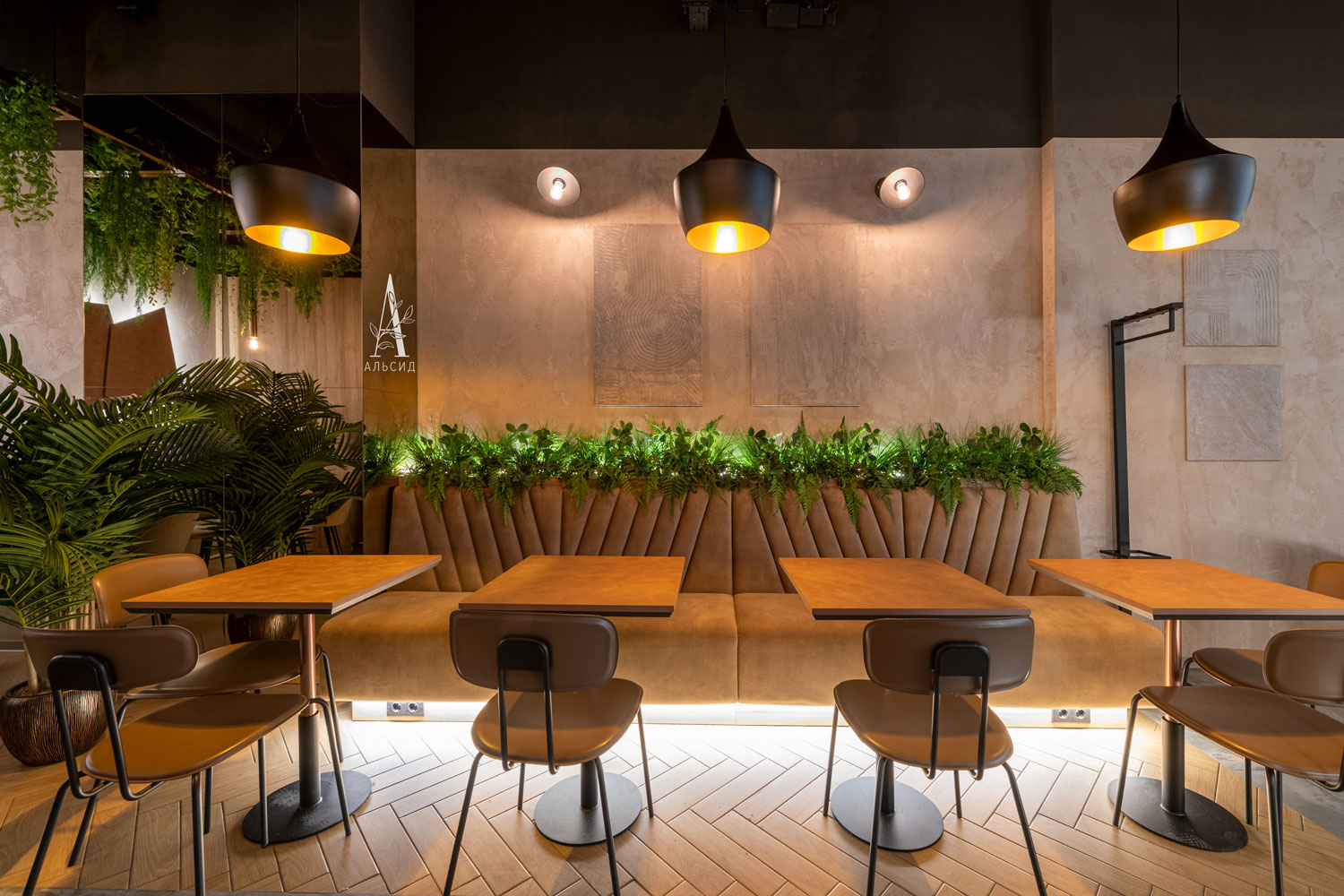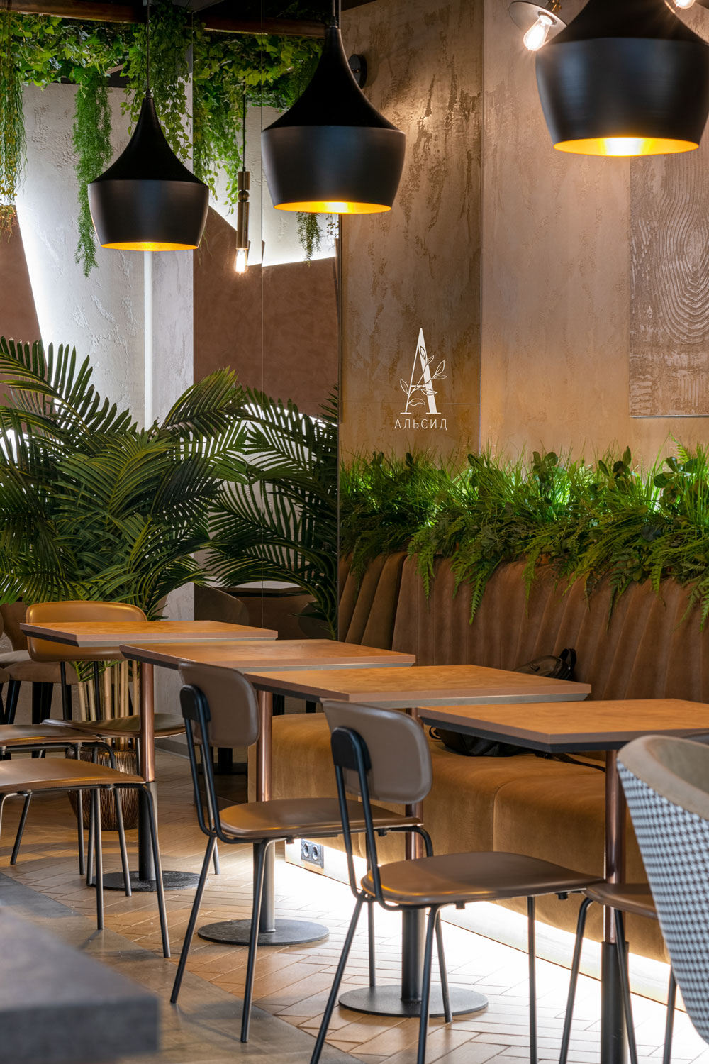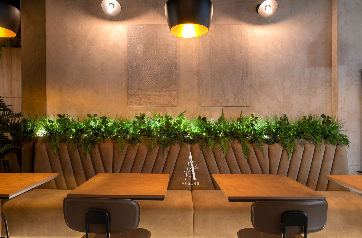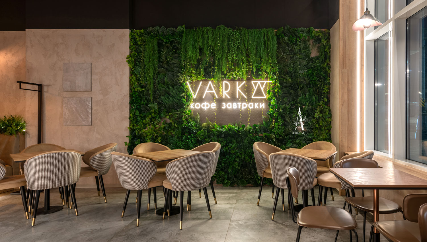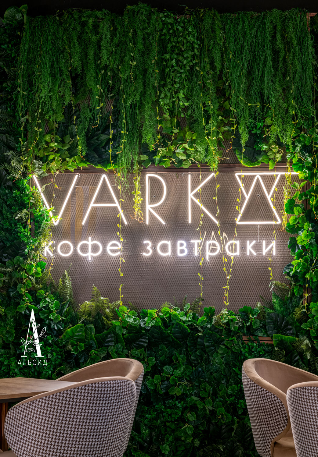 В кофейне Varka проведено комплексное озеление, а именно создание композиций разных форм и размеров для каждого уровня пространства: фитостена (монстера, сциндапсус, филодендрон) обрамляет логотип компании, напольные деревья (банан и пальма) добавляют акцент каждой зоне, папоротник с травой украшает линию спинки дивана, а свисающие с потолка разнообразные ампельные растения (плющ виноград, плющ пилея кадье, плющ хедера зеленая, трава ампельная, мюленбекия, традесканция, аспарагус) образуют красивый купол. Помогает поддерживать концепцию также небольшой бонсай в реструме. ;