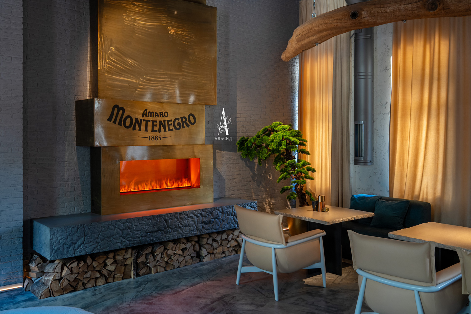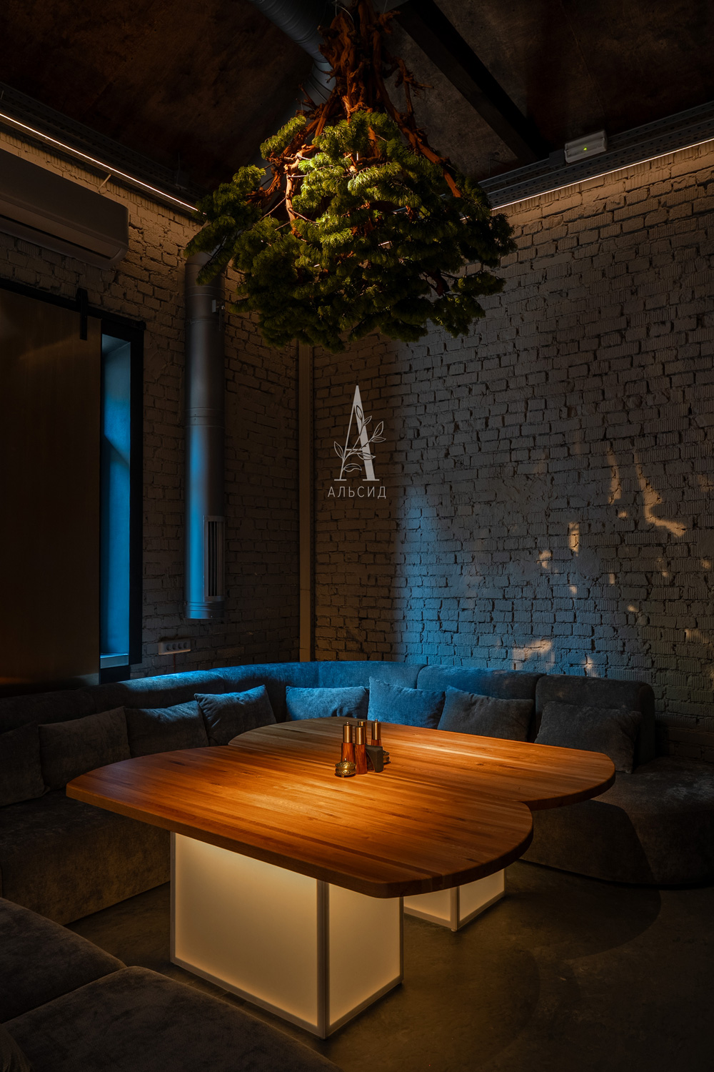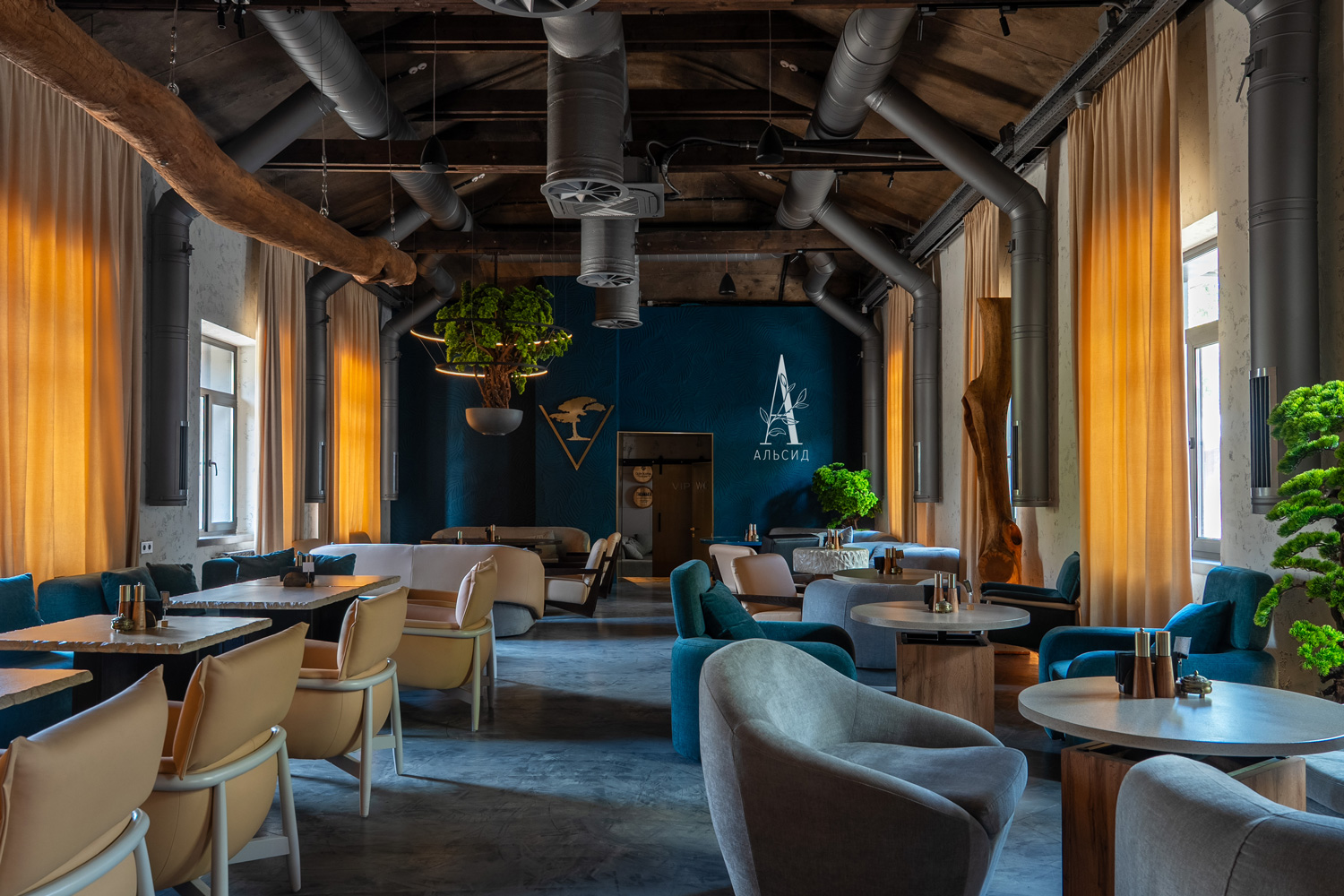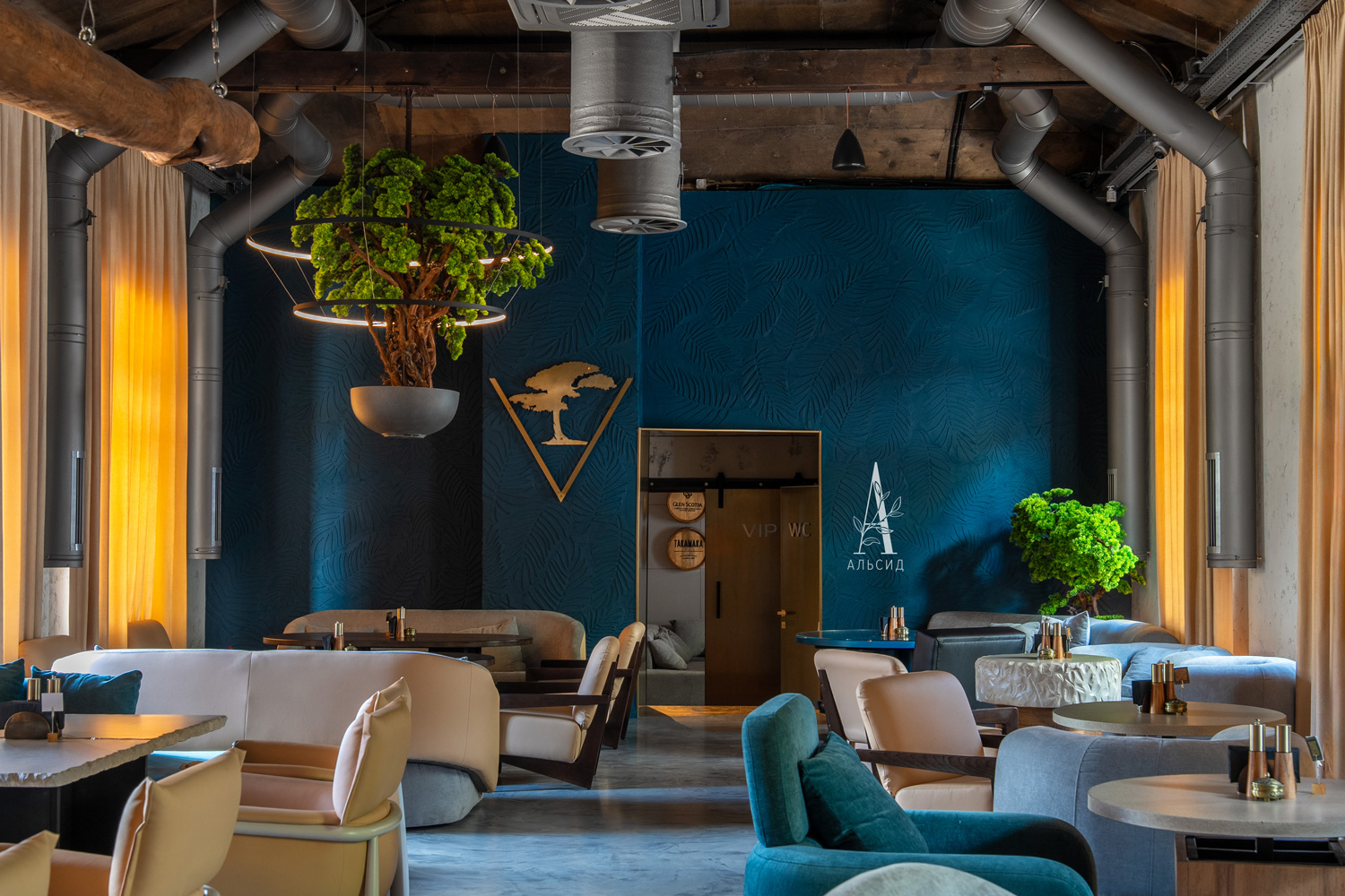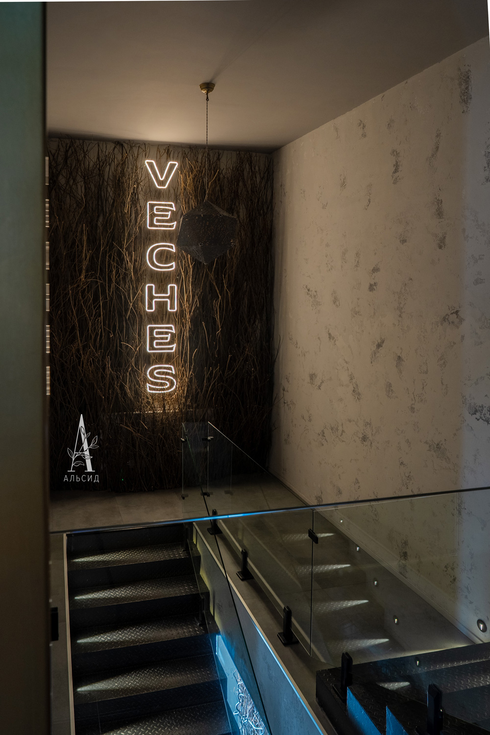 Оформление лаунж-ресторана было ограничено строгой концепцией, а именно необходимо подчеркнуть название и логотип "Veches". Поэтому для создания нужной атмосферы был выбран бонсай Сосна в разных формах и размерах. Открытый высокий потолок гармонично заполнен большим деревом как в кашпо, так и кроной вниз, что создает иллюзию волшебства. Входная группа и лестница обвита натуральными лозами веток, которые придают особенный шарм и передают характер заведения. ;