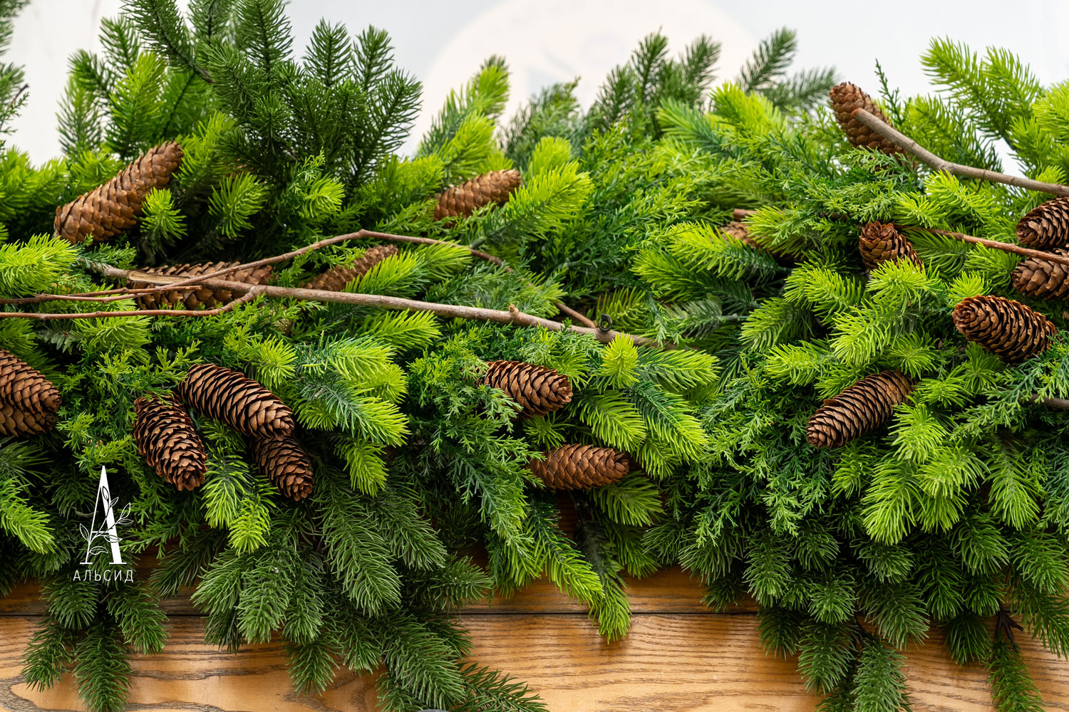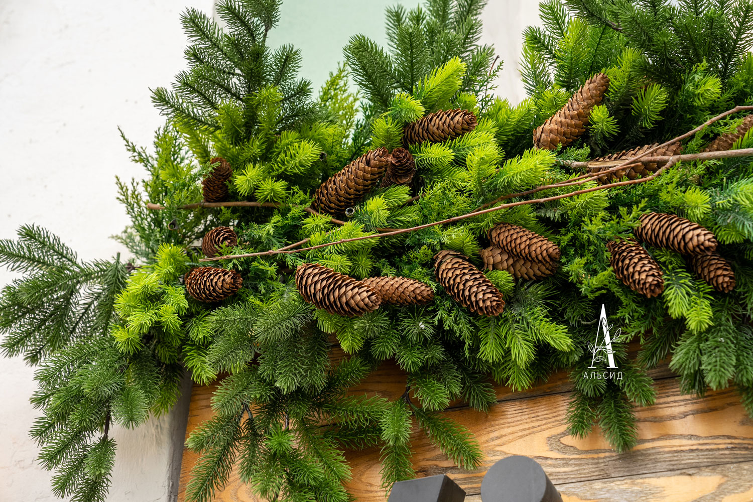 с натуральными шишками на ветках, благодаря которым композиция выглядит очень естественно, экологично и современно.;