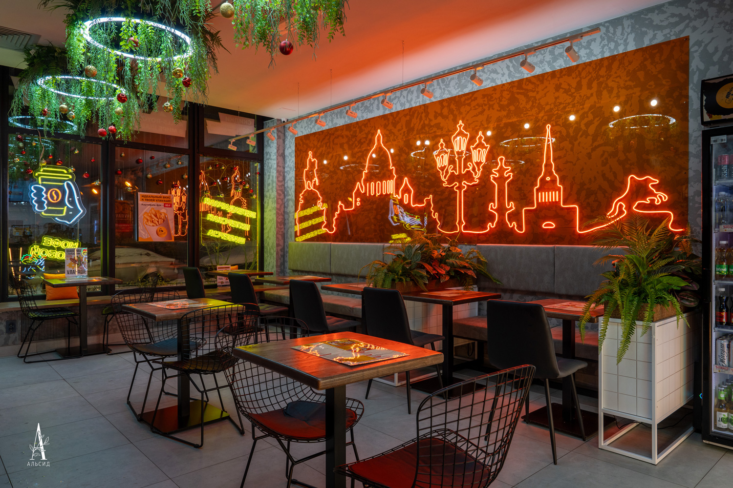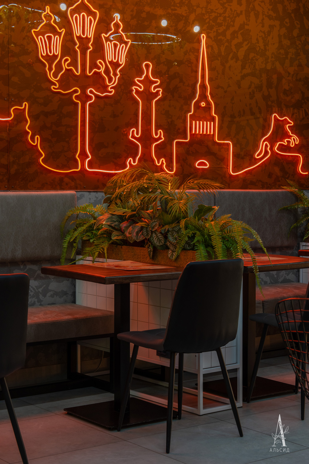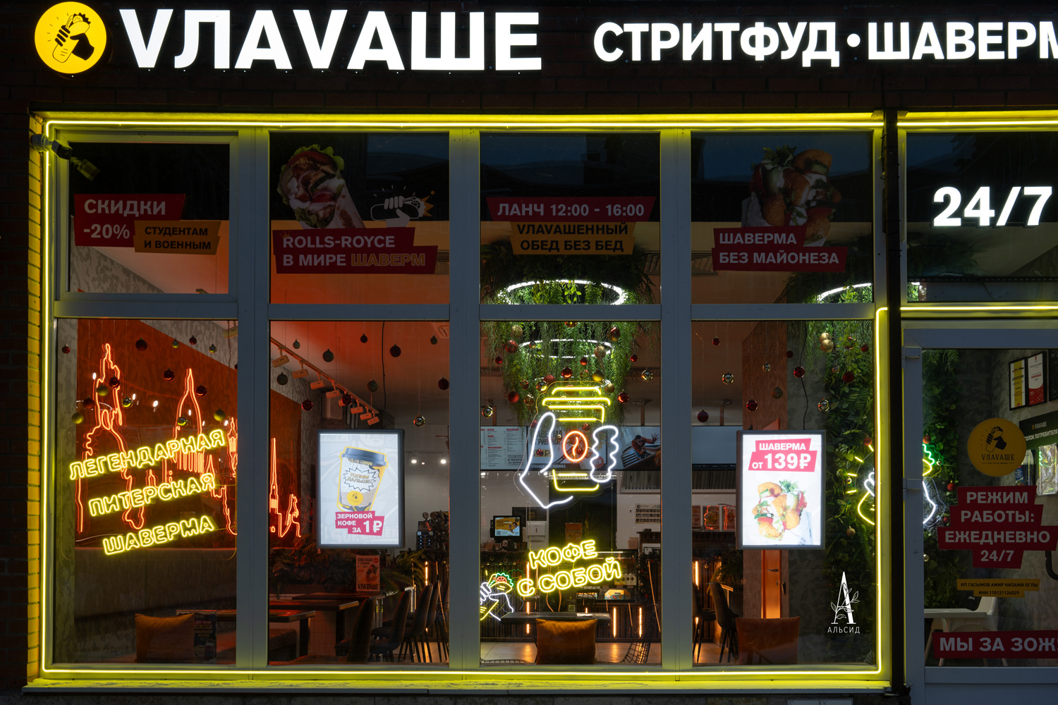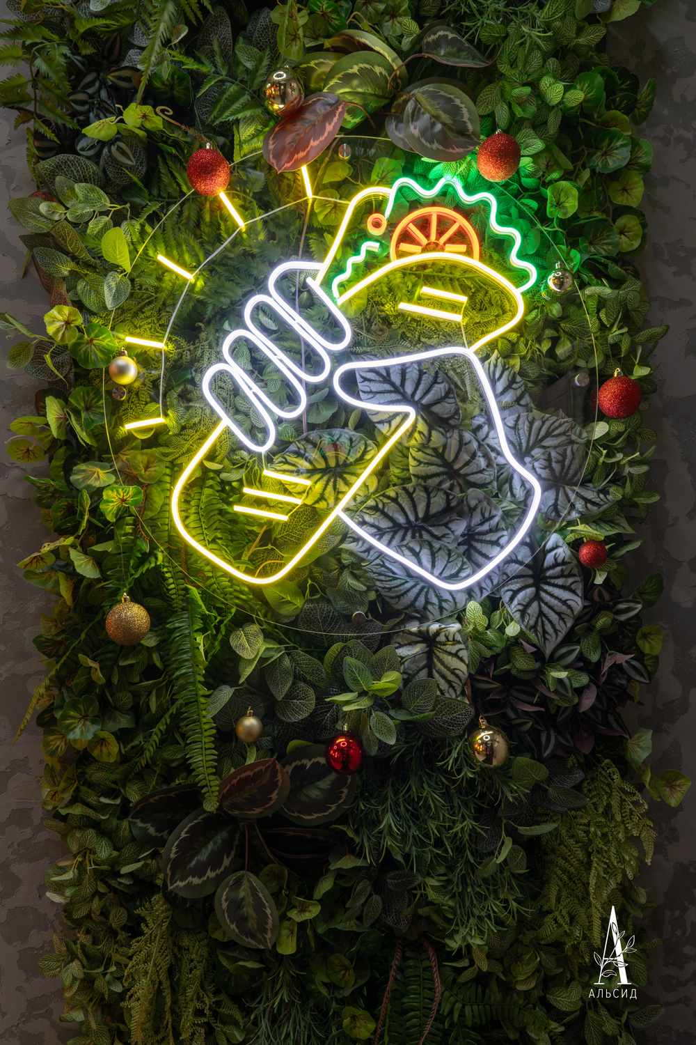 Комплексное озеленение знаменитой ресторанной сети стало неотъемлемой частью франшизы VЛАVАШЕ. В оформлении используются ампельные растения на подвесных светильниках, тропические композиции для зонирования столиков и фитостены как фон для логотипа, так и для обрамления зеркала в WC.;