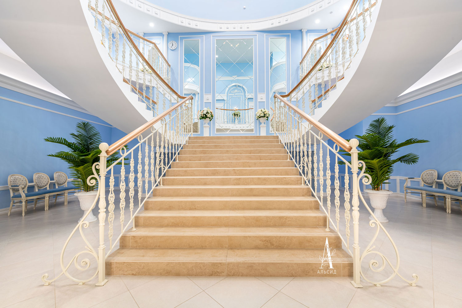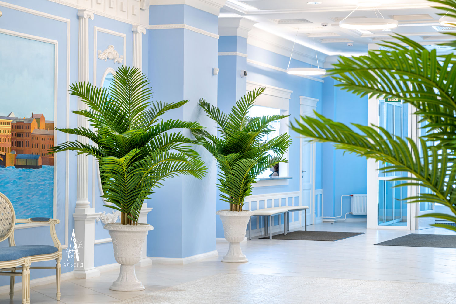 гипсофила). А холл и банкетный зал утопает в зелени, чтобы создать приятную атмосферу и зоны для фотосессий.;