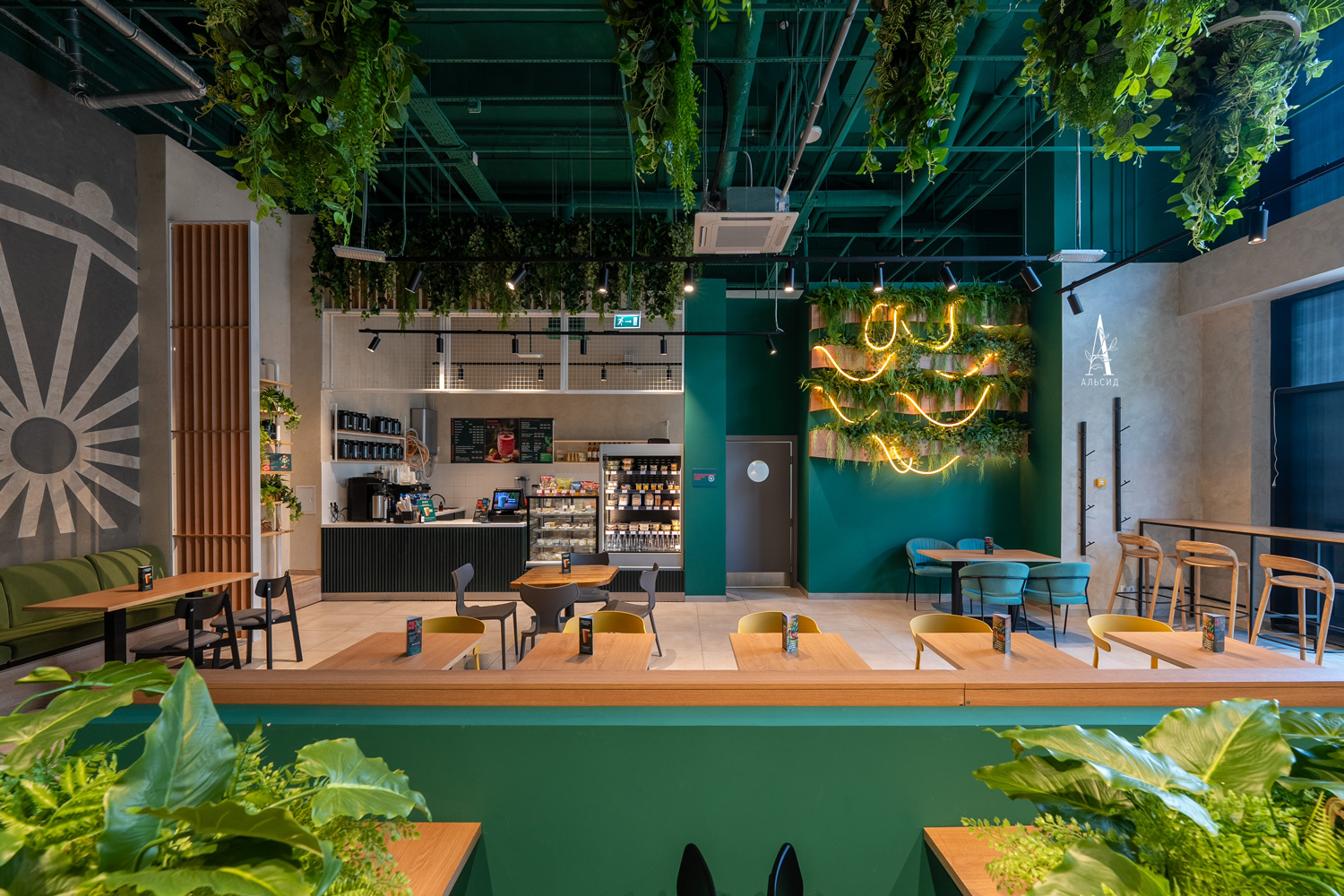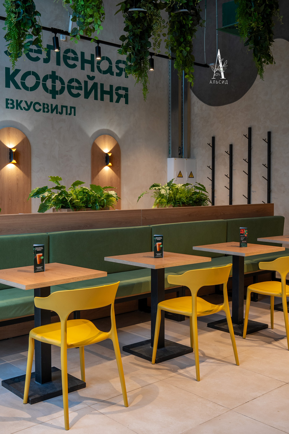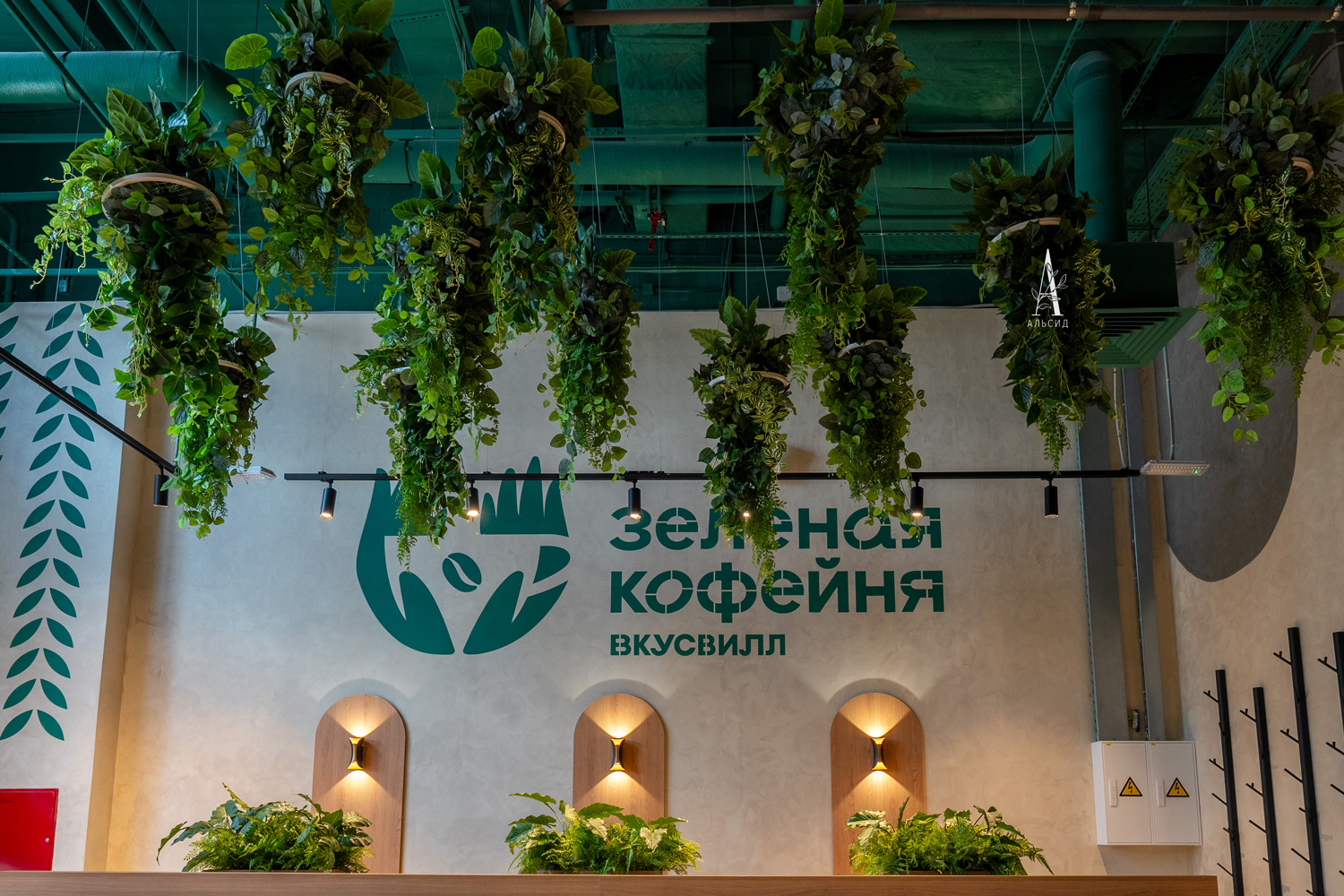 В первом кафе сети Вкусвилл оформление с обилием зелени поддерживет эко-концепцию проекта.Обилие ампельных растений, таких как синдапсус, пилея кадье, самшит, фиттония, даксин, хедера и филодендрон, благодаря своему смешению, образуют лиану в зоне кассы. Способ крепления растений на реечное основание позволяет создать воздушное и максимально приближенное к естеству озеленение. Эти же растения смотрятся совсем иначе в подвесных потолочных композициях.; Зеленые композиции в кокосовых боксах (микс с пилеей, микс с папоротником, микс с кадье) распределены по всему помещению: одни зонируют пространство, другие декорируют ниши на стене с кабельной подсветкой, а также являются прекрасным дополнением в качестве декора навесных полочек. Кроме того, тропический микс встречает гостей во входной группе.;