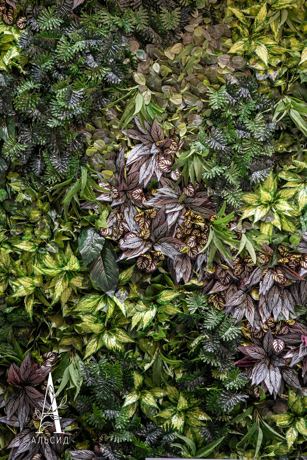 Дизайн холла в черном цвете поддерживают неяркие фитостены из искусственных растений, которые вносят дополнительную текстуру на стенах. В уборной была сделана глубокая ниша, куда поместили объемную фитокартину в мини флорариуме.