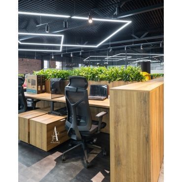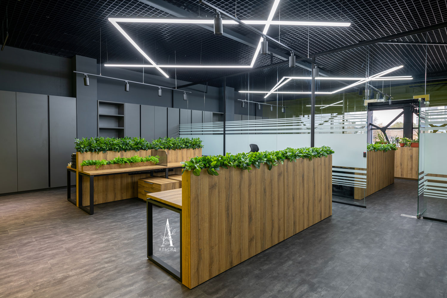 Благодаря своему удобству и декоративности искусственные растения в открытом офисе стали уже классическим оформлением. Все пространство поделено на зоны, на границах которых располагаются зеленые боксы шеффлера и зеленый микс.