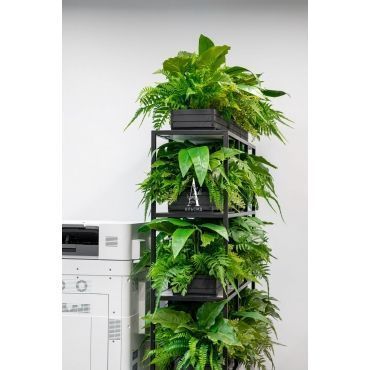 Оформление искусственными растениями офисного пространства также требовательно, как и в любом другом общественном объекте, ведь необходимо подобрать растения согласно фирменной концепции. Строгий выдержаный стиль офиса подчеркивают композиции из зеленых растений в черном деревянном ящике, специально изготовленном для проекта. Композиции можно использовать как в качестве перегородки для отделения зоны принтера, так и для украшения стеллажей.