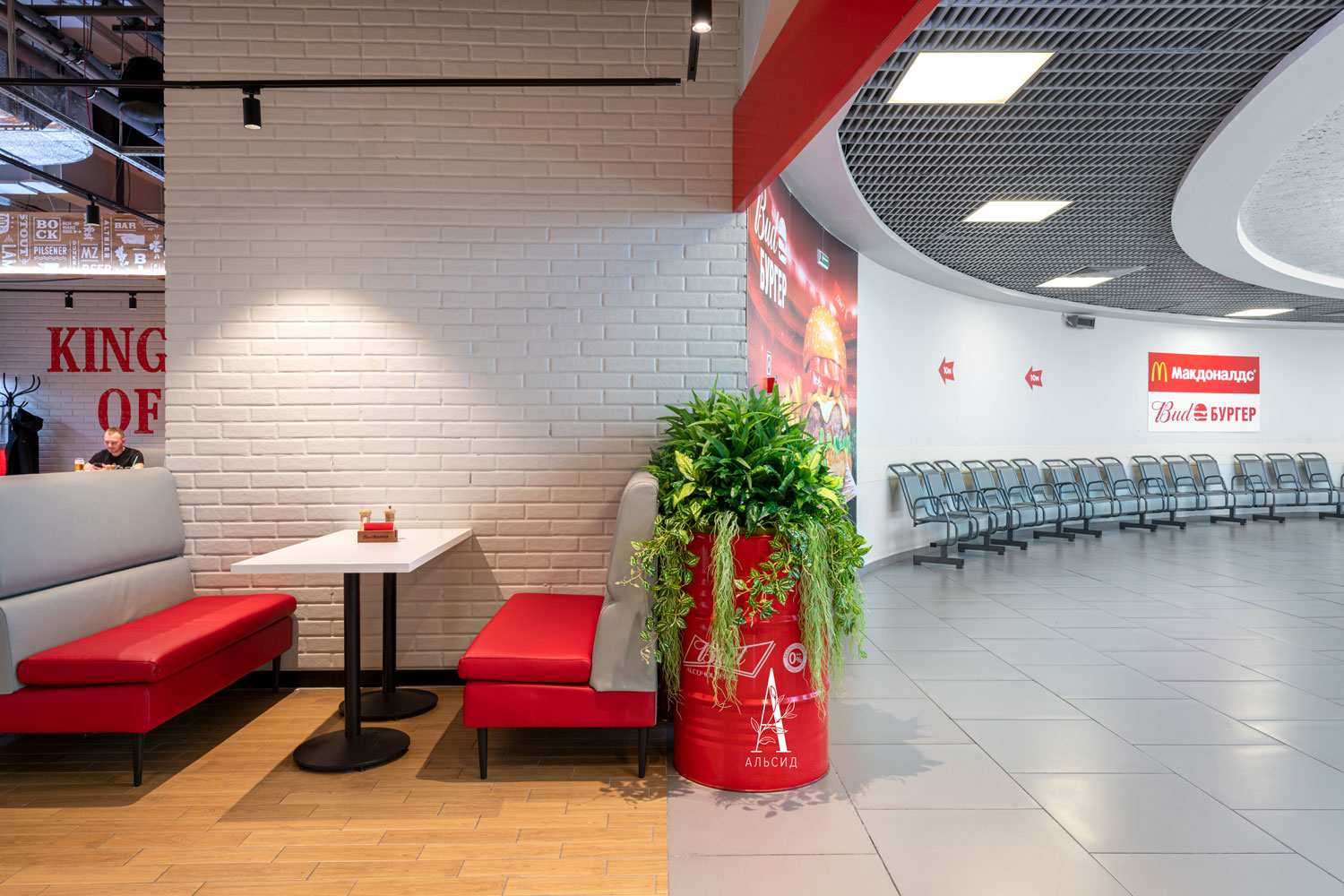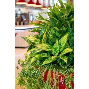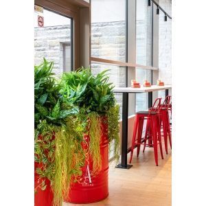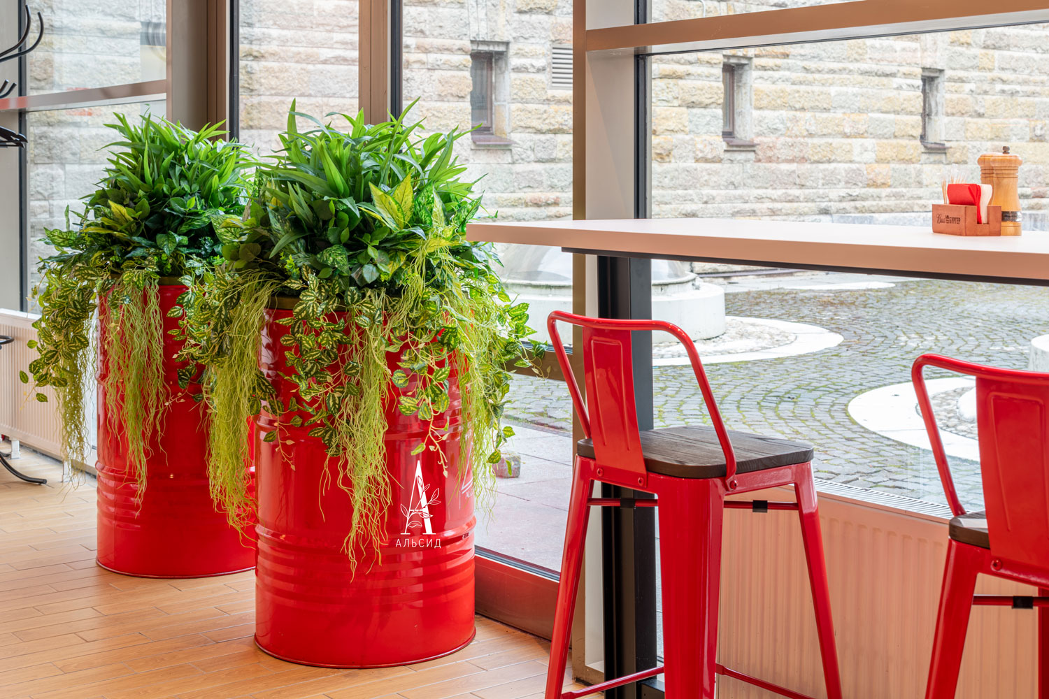 Композиция из тропических растений была создана специально под размер декоративной бочки в виде модульной вставки. Такой декор также обладает многофункциональностью: композиции можно использовать как вместе с бочками, так и по отдельности, придавая интерьеру новый вид.