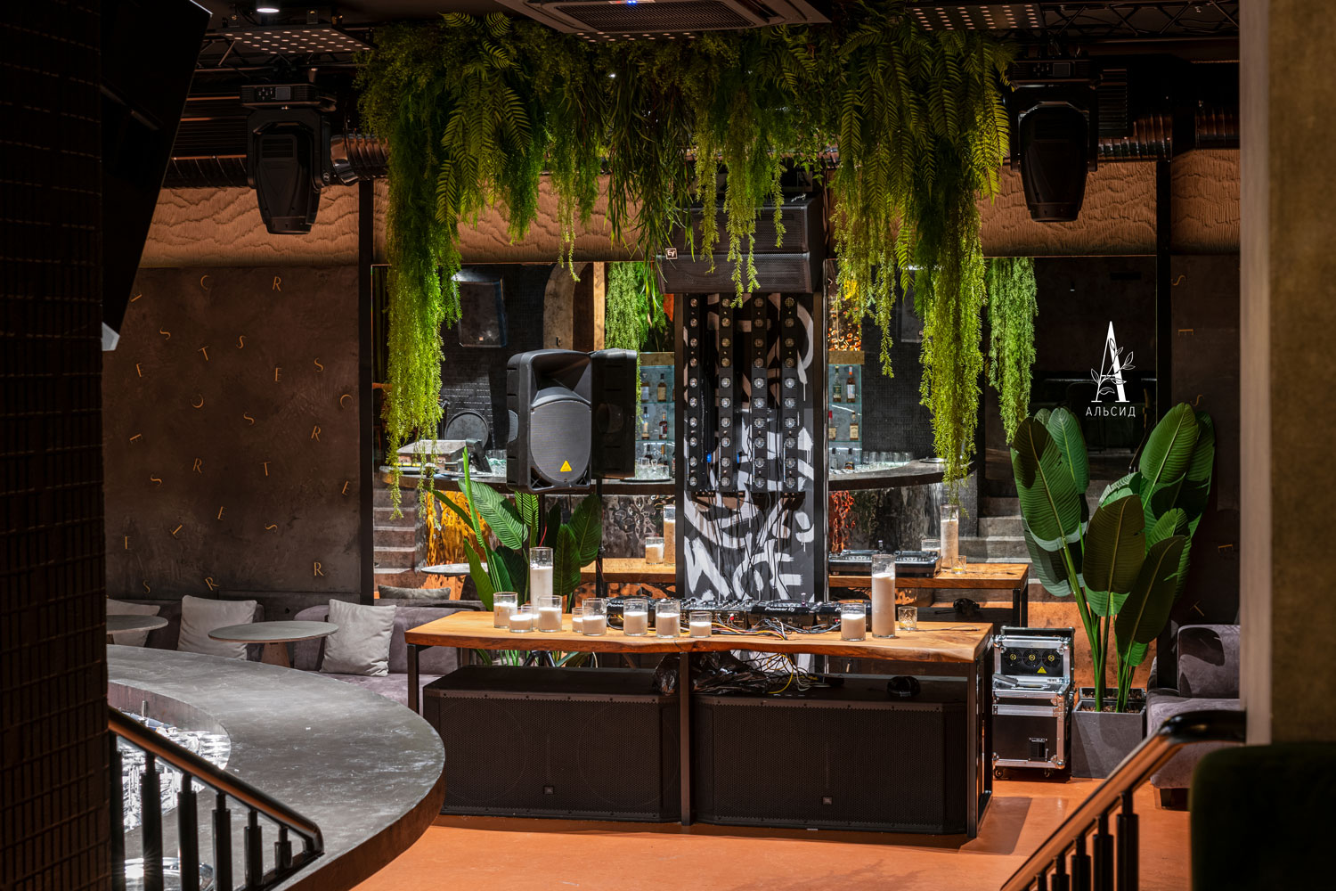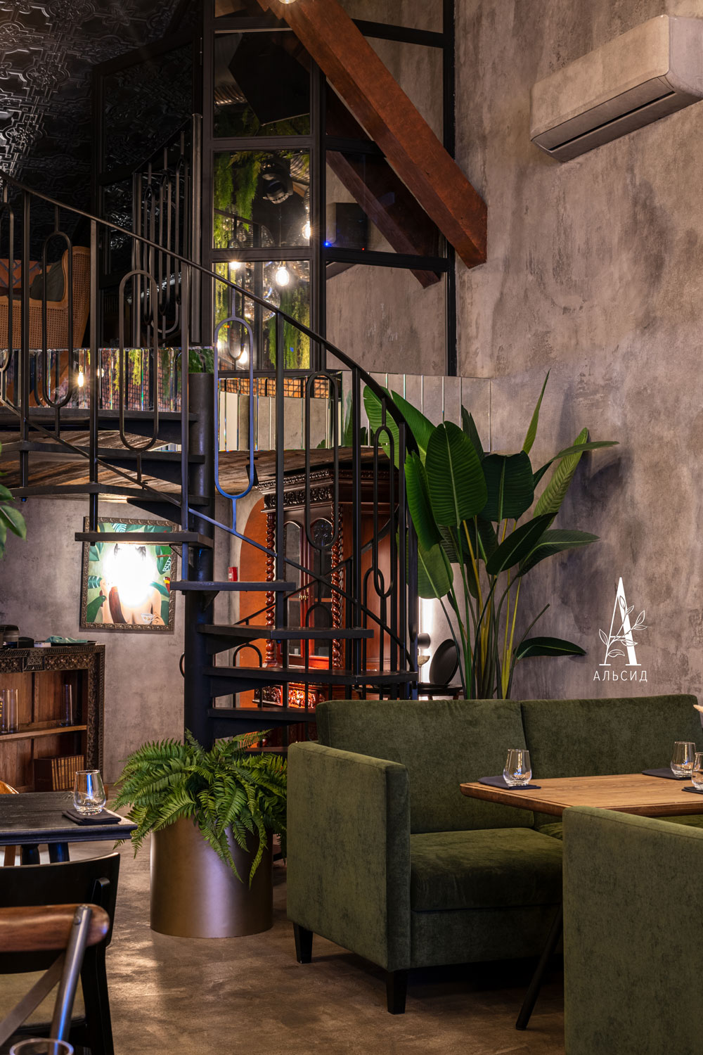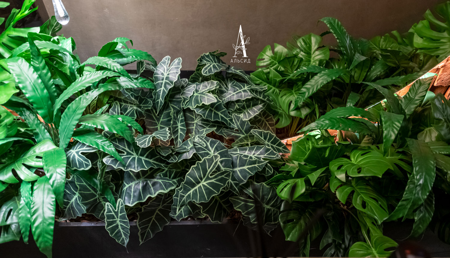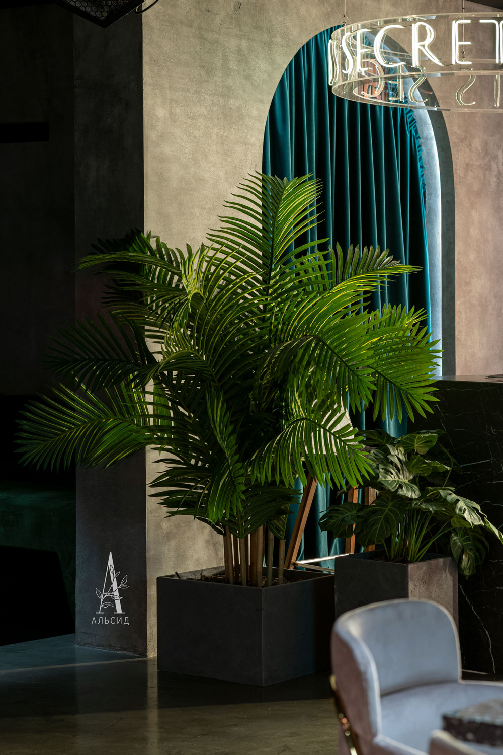 Для оформления двухуровнего лофта Tsinist были использованы элементы ар-деко и эклектики, в которые так хорошо вписываются искусственные растения разных размеров: банан (120см, 160см, 180см, 200см), пальма кустовая 180см, агава, монстера. Лианы с ампельными растениями обрамляют потолок. А в уборной установлен островок с раковиной с тропической композицией: пальма, каладиум, калатея, алоказия Полли.