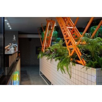 Объемное озеленение всегда выглядит эффектно и образует тропический оазис, в котором хочется отдохнуть. Ведь именно он может привлечь внимание посетителей с улицы через панорамные окна. На входе встречают кусты с ампельными растениями, которые наполняют пространство длинного коридора. Столики, зонированые высокими композициями, вместе с потолочными люстрами подвесами создают уют и уединение. На потолках подвесные люстры. А зона заказа и выдачи полностью огорожена так же с помощью боксов с зеленью.