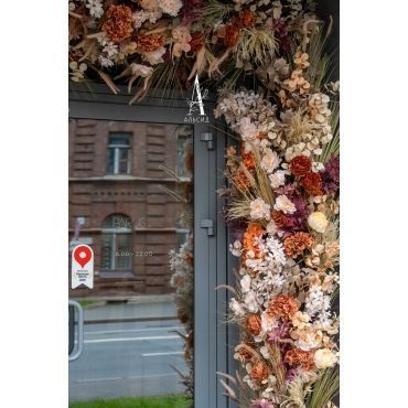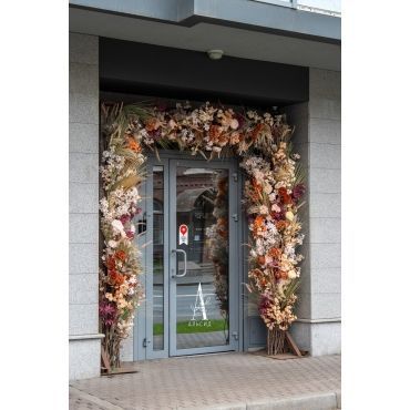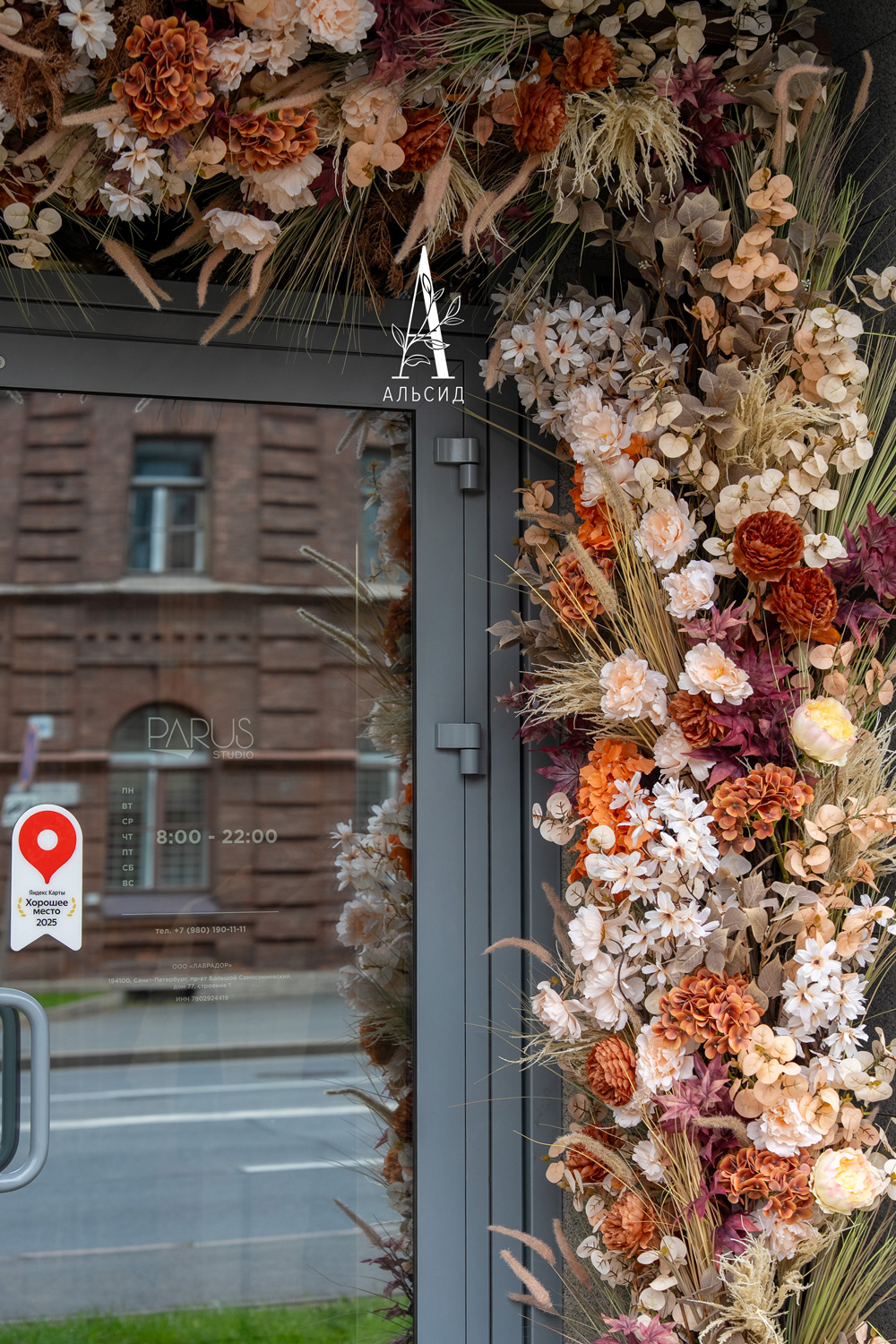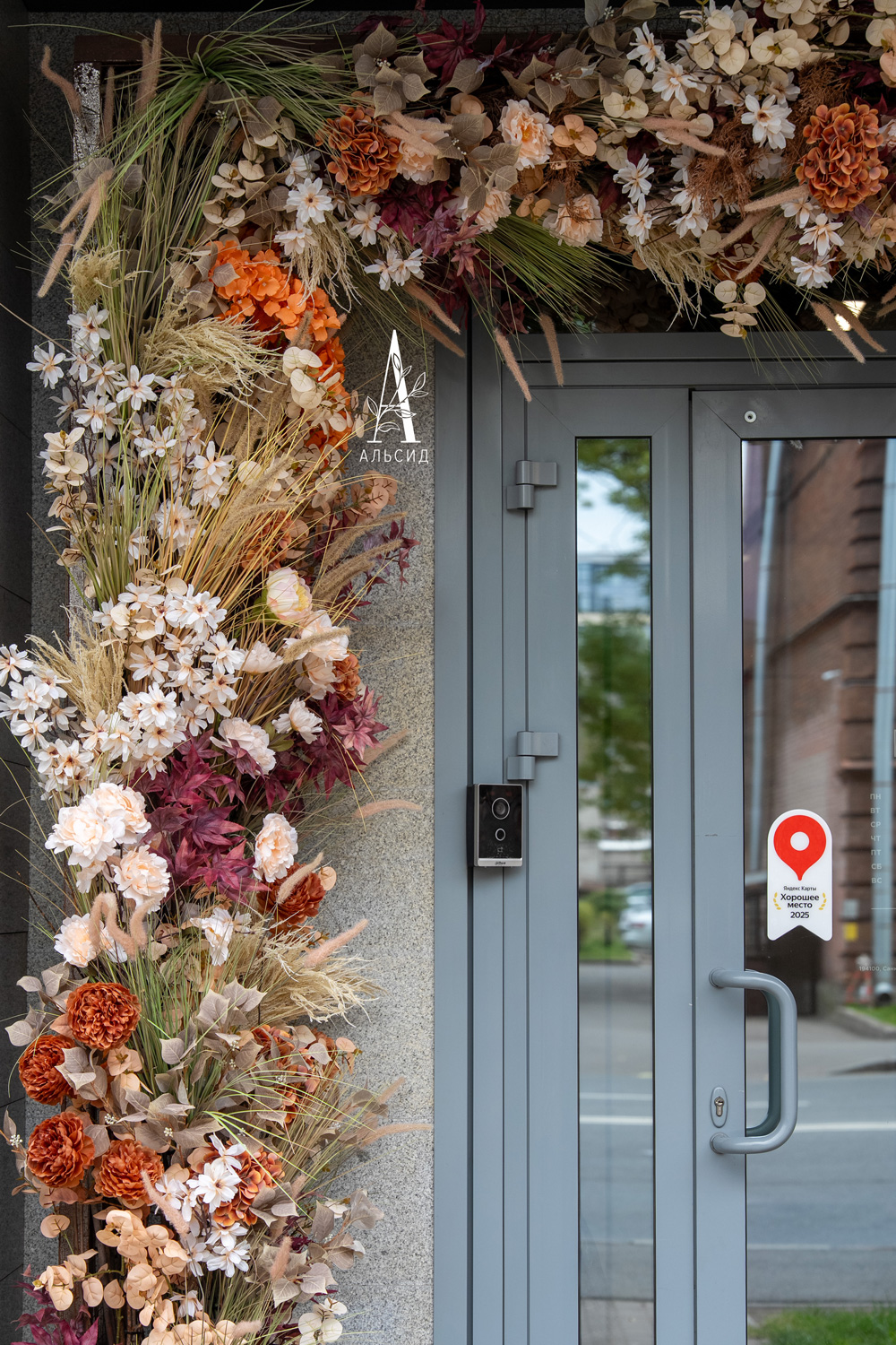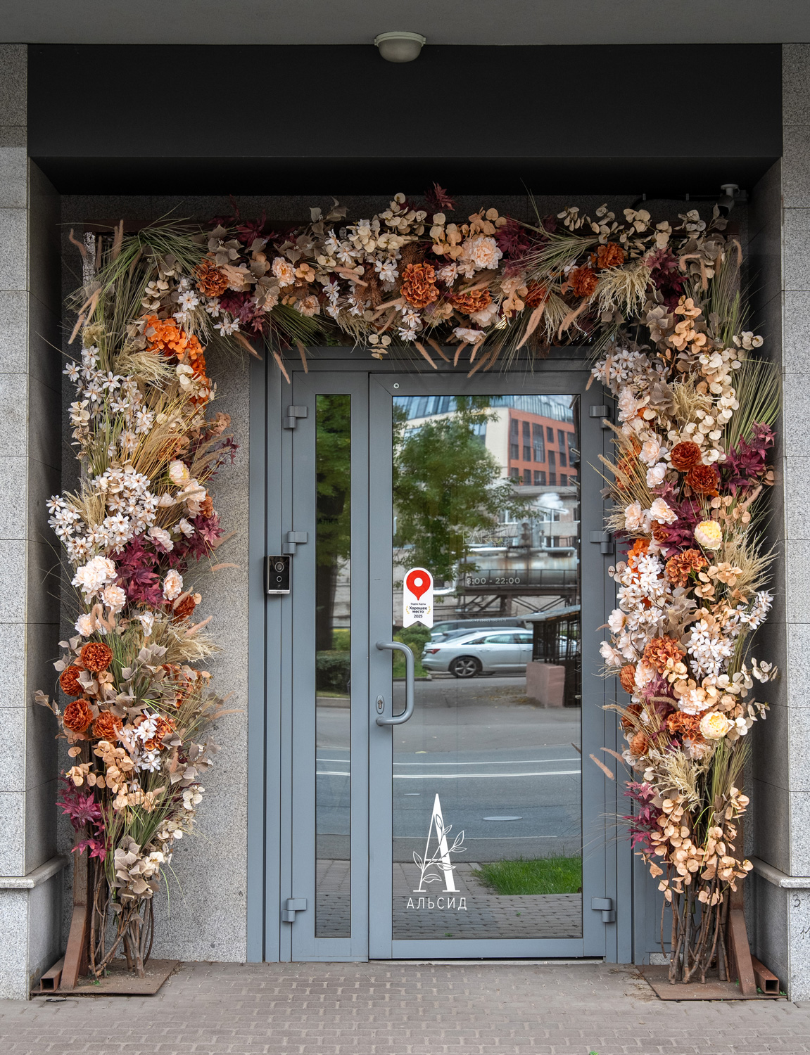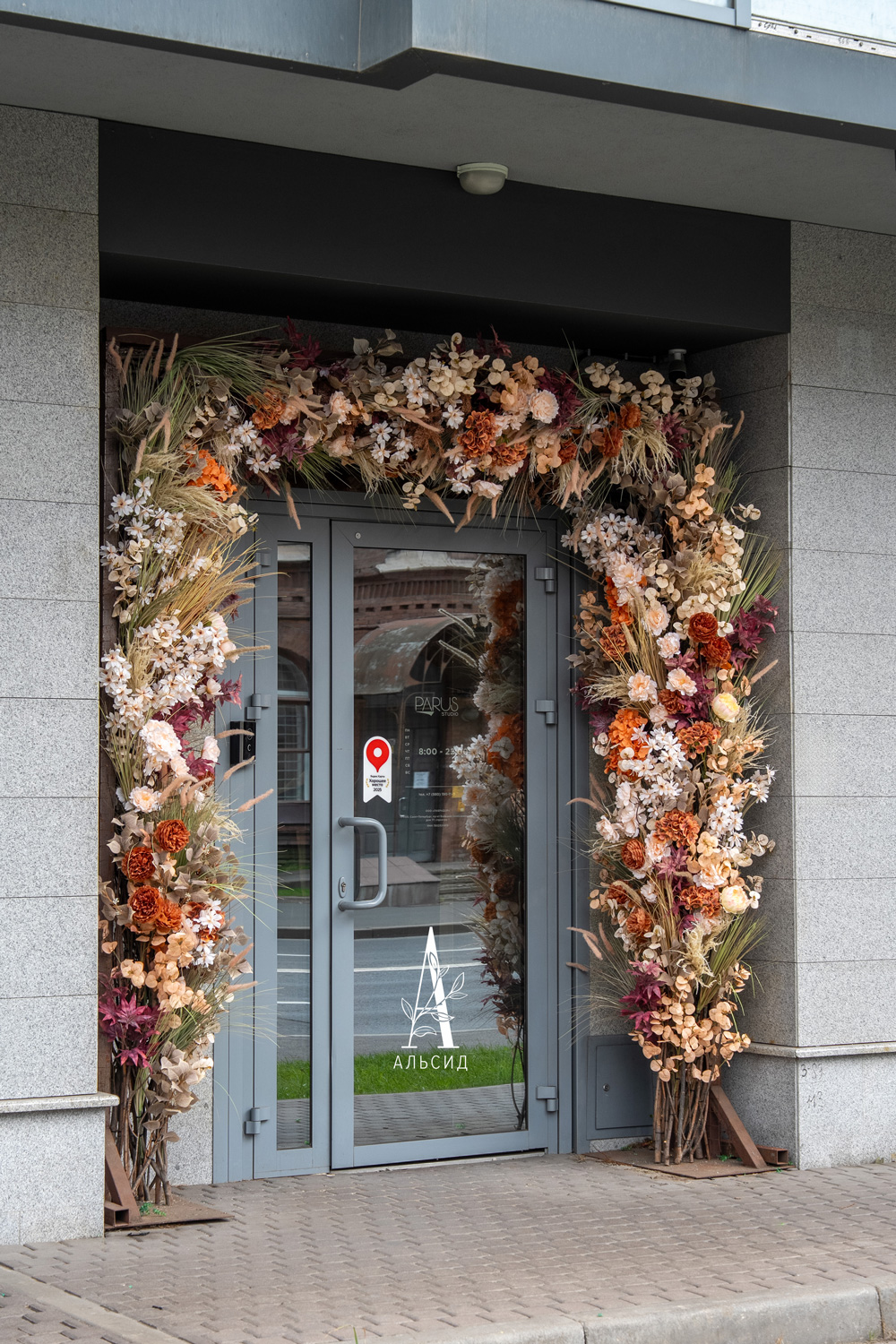 Роскошный декор с нежными цветами в осенних оттенках украшает вход в клуб. Арочка сразу привлекает внимание и гармонично смотрится с архитектурой здания.