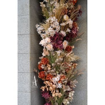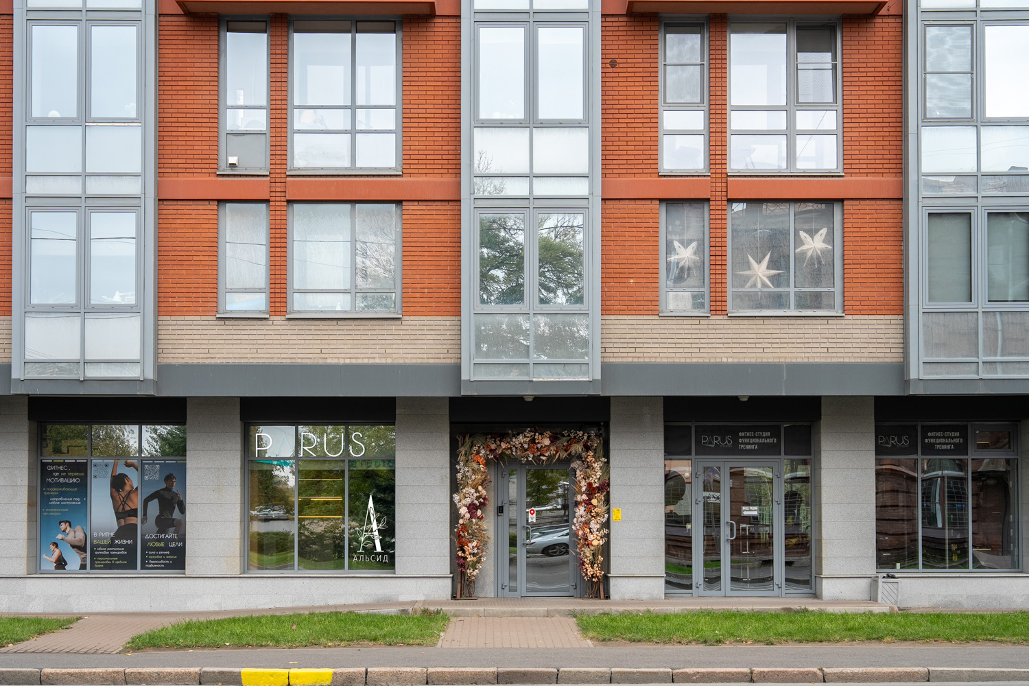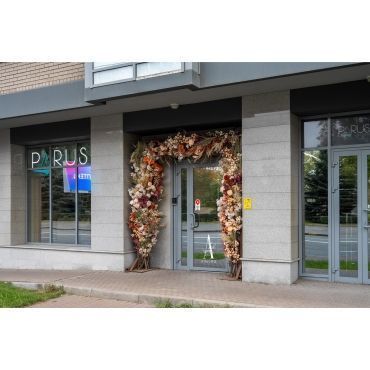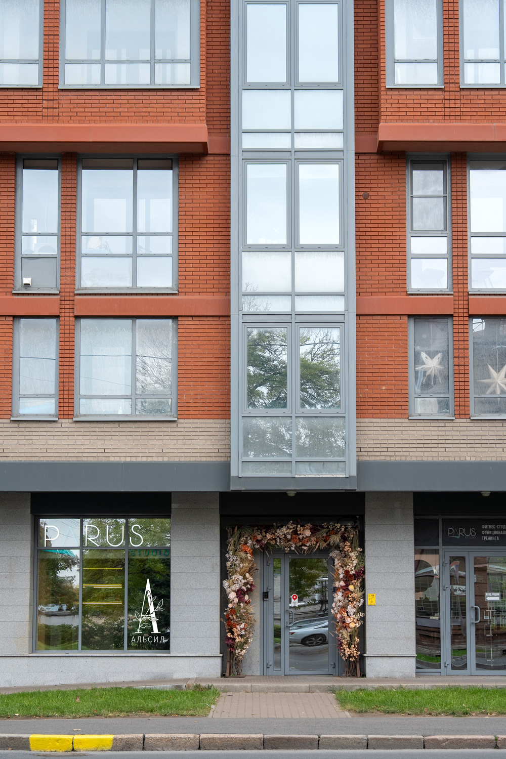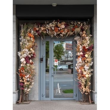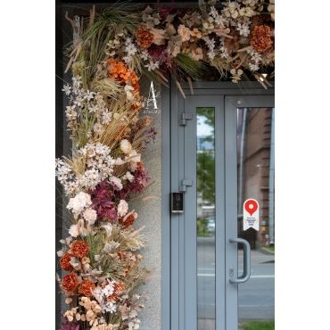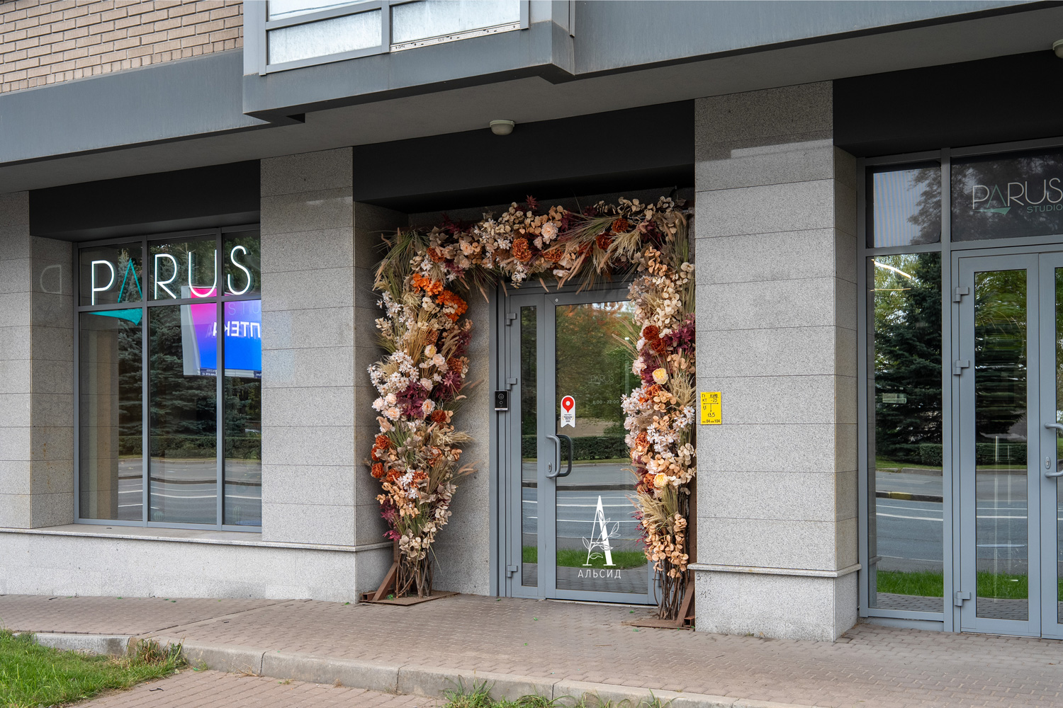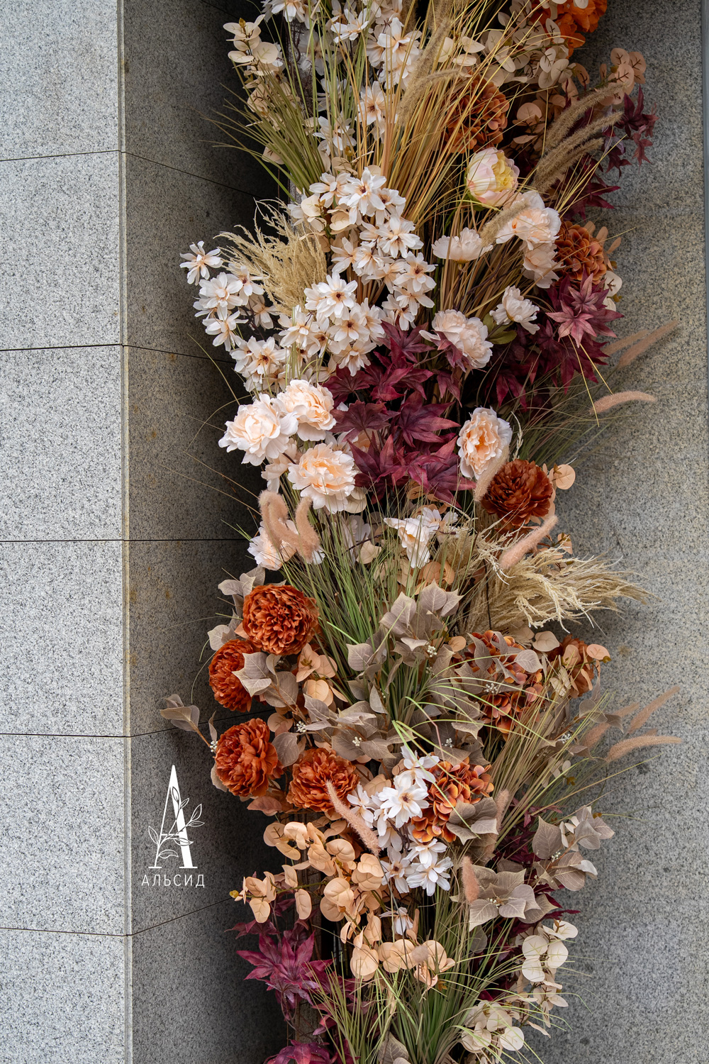 Роскошный декор с нежными цветами в осенних оттенках украшает вход в клуб. Арочка сразу привлекает внимание и гармонично смотрится с архитектурой здания.
