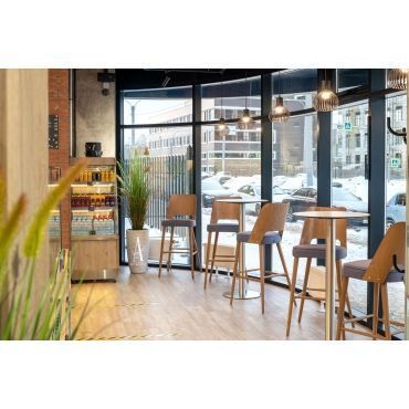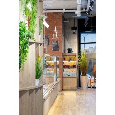 При создании обеденного пространства при бизнес-центре нужно также учитывать, что кафе является и местом отдыха. Поэтому дизайнеры обязательно включают в интерьер искусственные растения, которые создают дополнительный комфорт и уют. Зеленые композиции в кокосовых боксах хорошо подходят для стеллажей для зонирования и украшения пространства. А трава с камышом в высоких кадках отлично гармонирует на фоне панорамных окон.