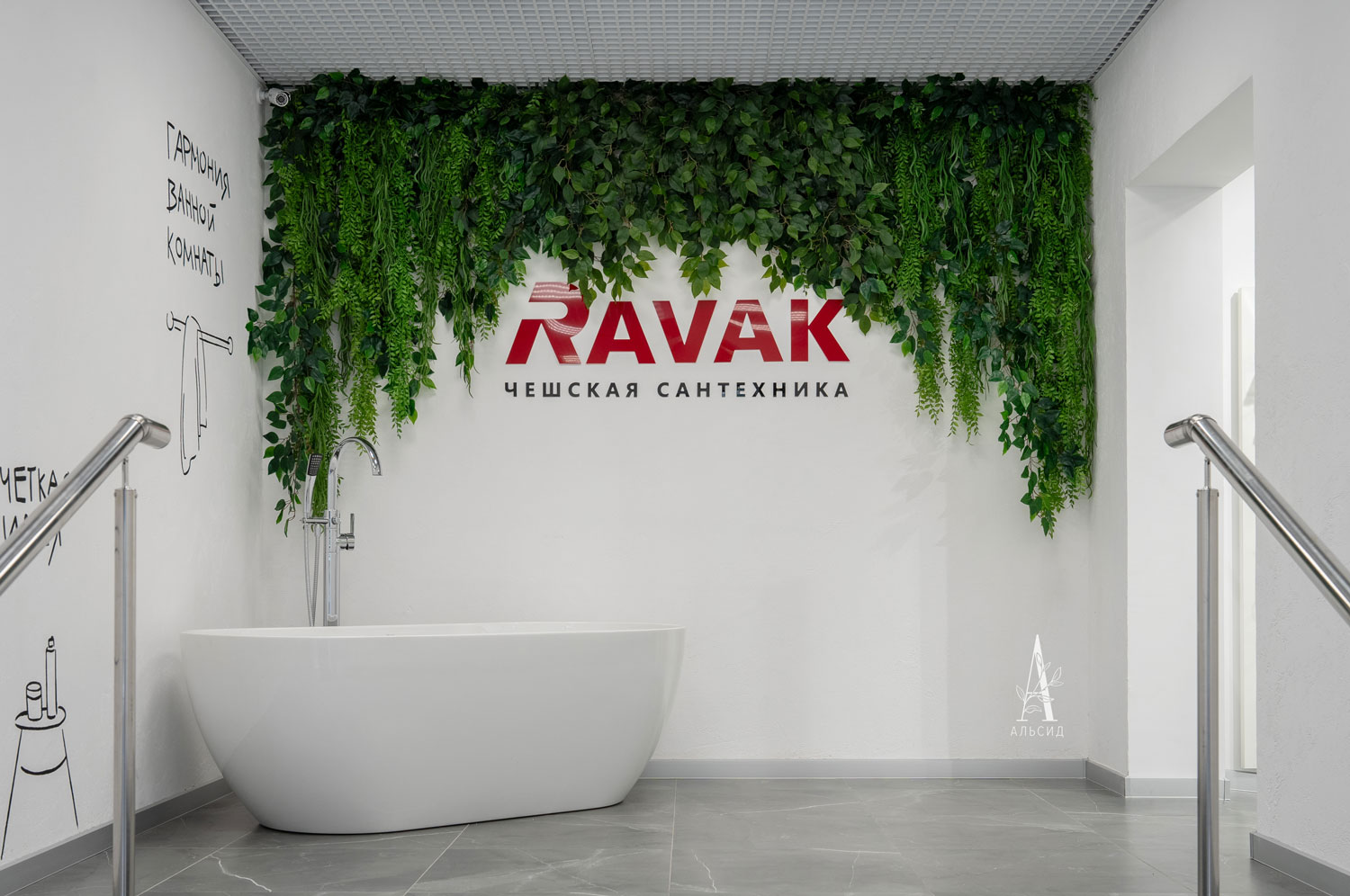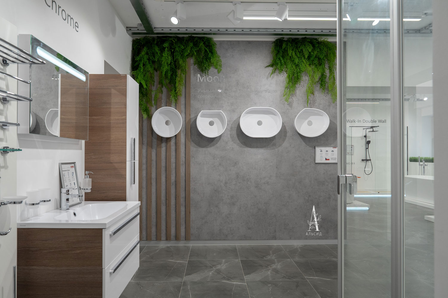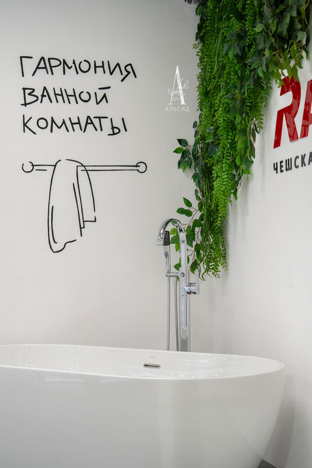Дистрибьютерский магазин чешской сантехники премиального качества выполнен в моно-дизайне с зеленым акцентом, характеризующий свежесть и умиротворение. На входе встречает инсталляция с ванной, над которой свисают лианы. Все логотипы компании обрамлены ампельными растениями с ветками адиантума, ивы, даксина и фикуса. А вдоль экспозиций установлены боксы с травой.