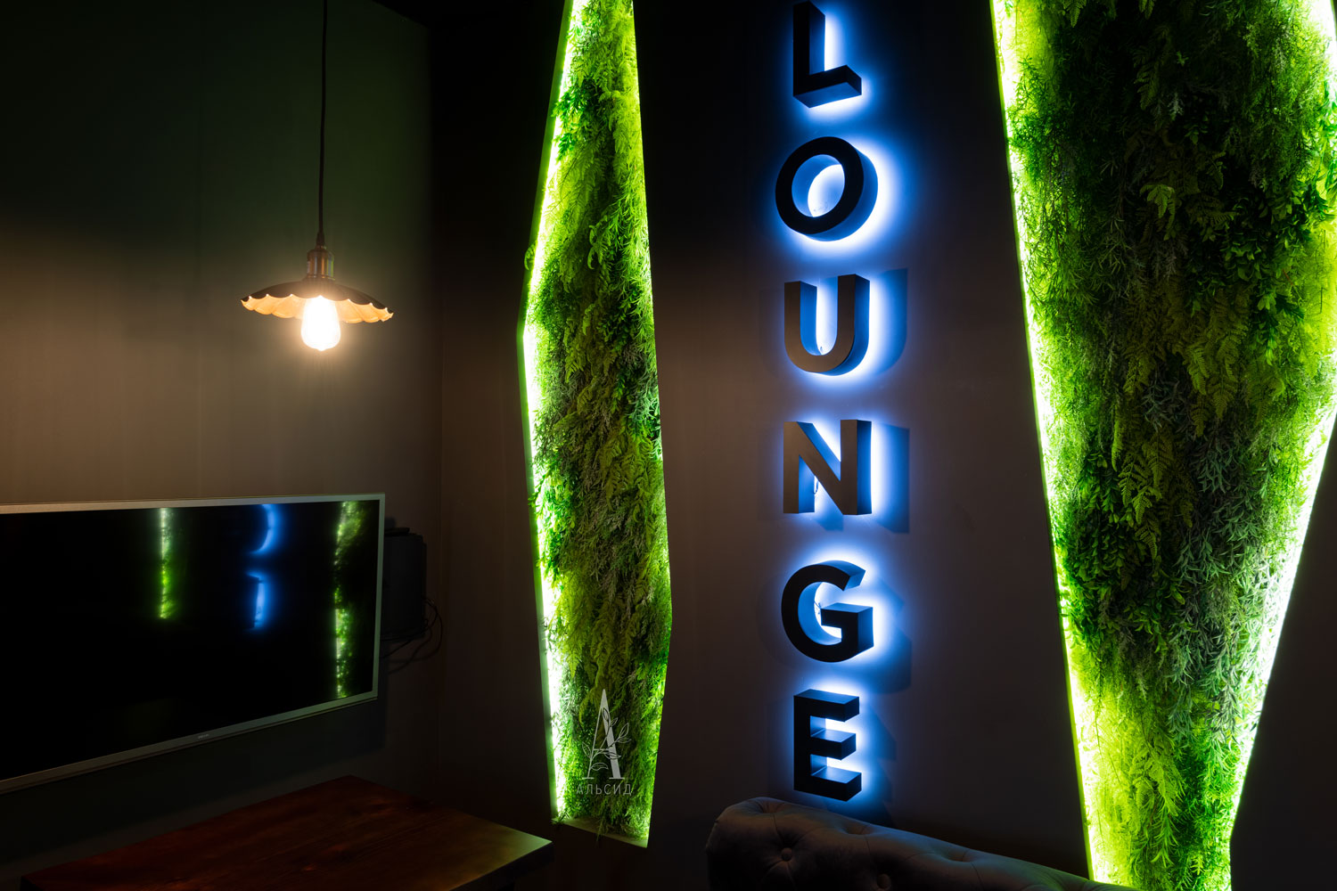 Для темного интерьера с подстветкой отлично подходит фитостена с зелеными растениями, а для фотозоны выбрали тропический микс - фитостену с объемным мхом и папоротниками.