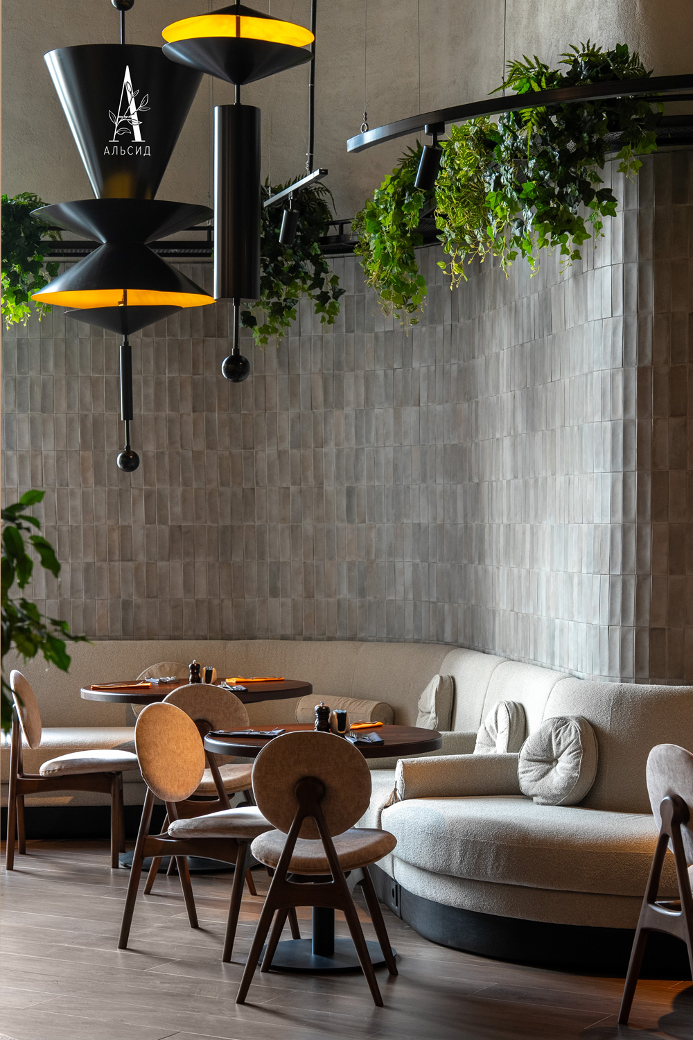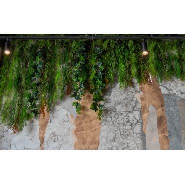 Для оформления пространства с высокими потолками дизайнеры выбрали ампельные растения из искусственных премиальных материалов: хедера, пилея с папоротником, плющ, пилея кадье, традесканция. На мраморной стене лиана из хедеры, рипсалиса, даксина, адиантума, асплениума.