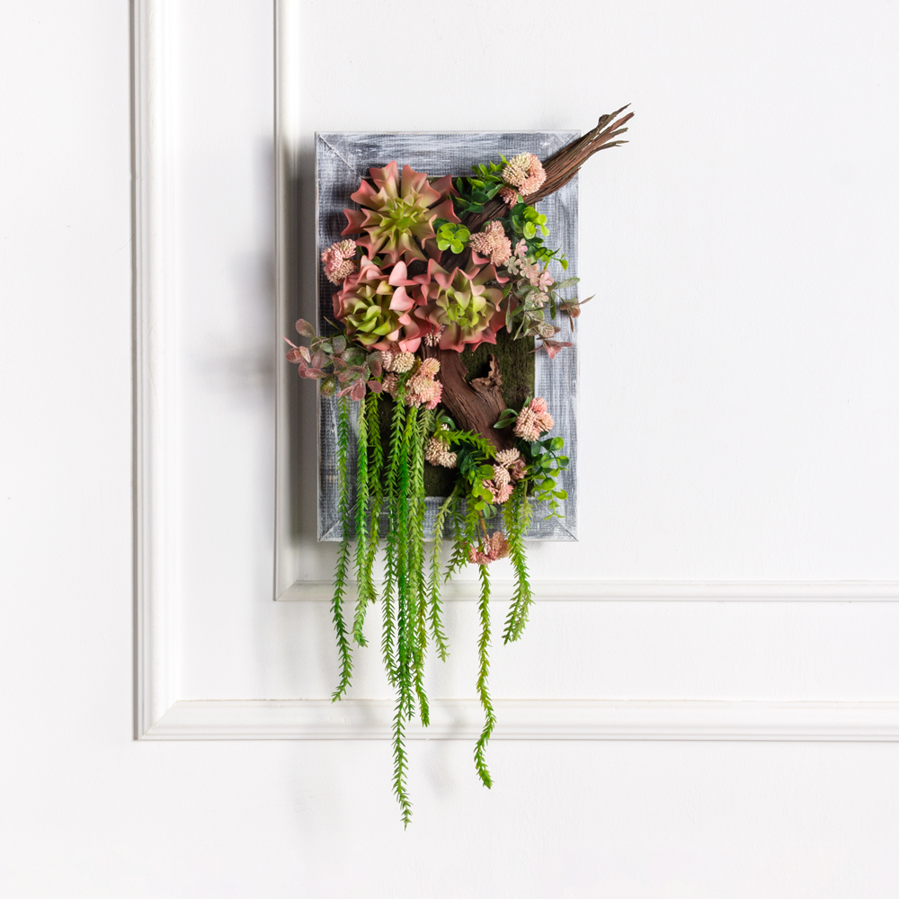СКФ02-3(F) Фитокартина искусственная с суккулентами 30х30см в деревянной раме, розовый