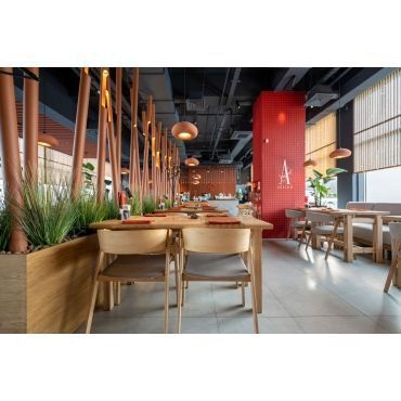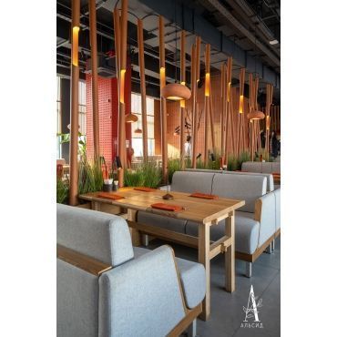 В азиатском ресторане Тануки зал поделен на 2 зоны, которые разделяют бамбуковые стебли и трава, имитирующие естественную природу, где ощущается гармония и умиротворение.