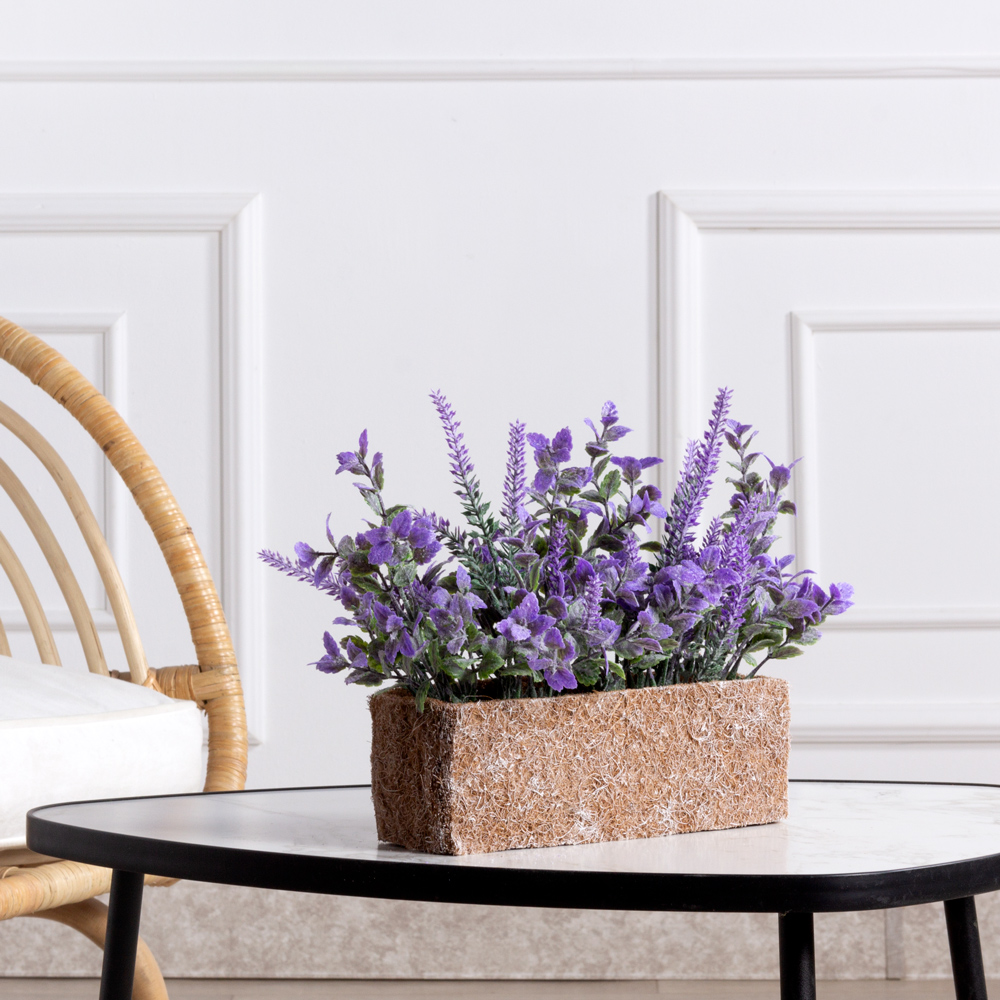 ТД042-1(F) Лаванда искусственная с зеленью (фиолетовая) h25см в забеленном кокосовом боксе 25х8х8см