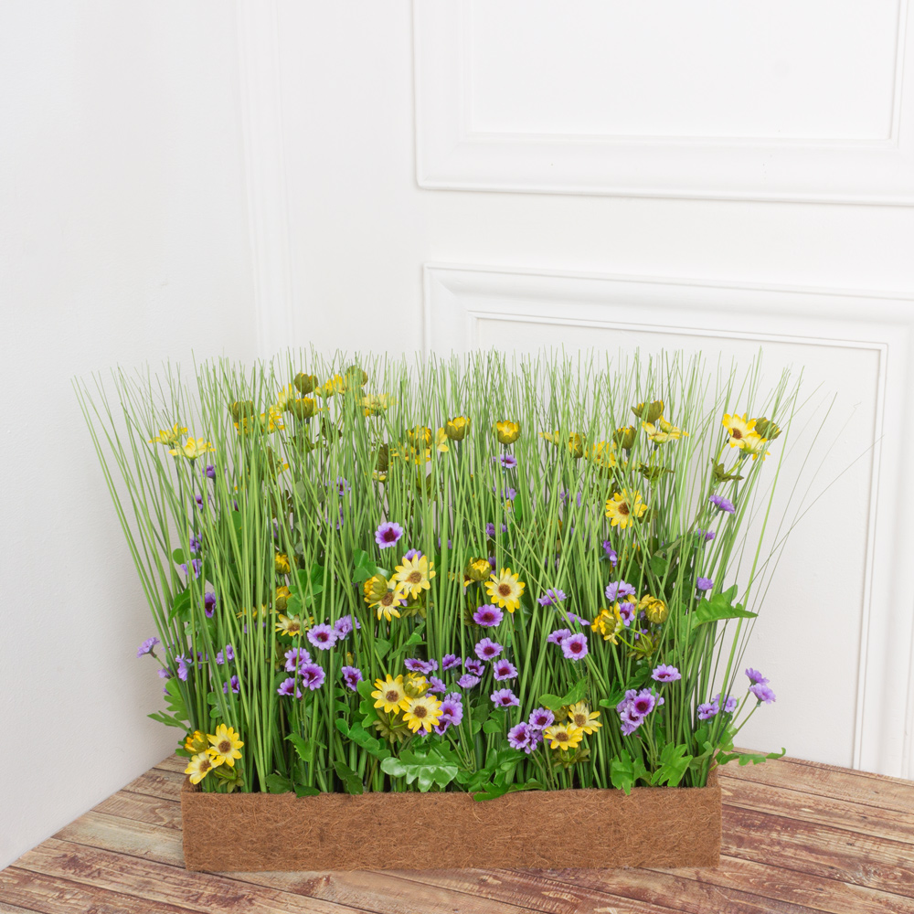 ТД056-7(з) Трава искусственная осока с ромашкой h40см в кокосовом боксе 50х8х8см