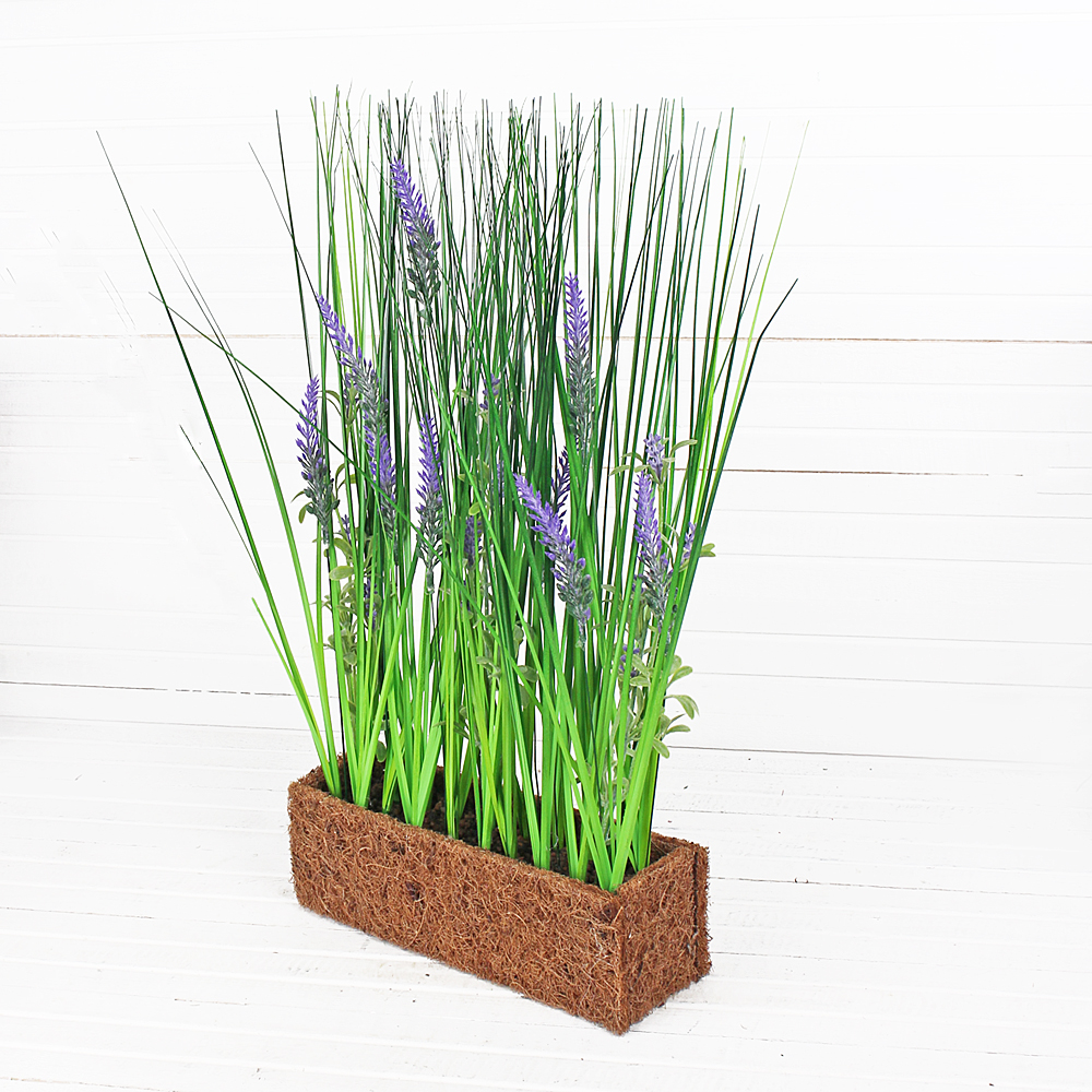 ТД056 Трава Осока искусственная h40cм с лавандой в кокосовом боксе 25х8х8см