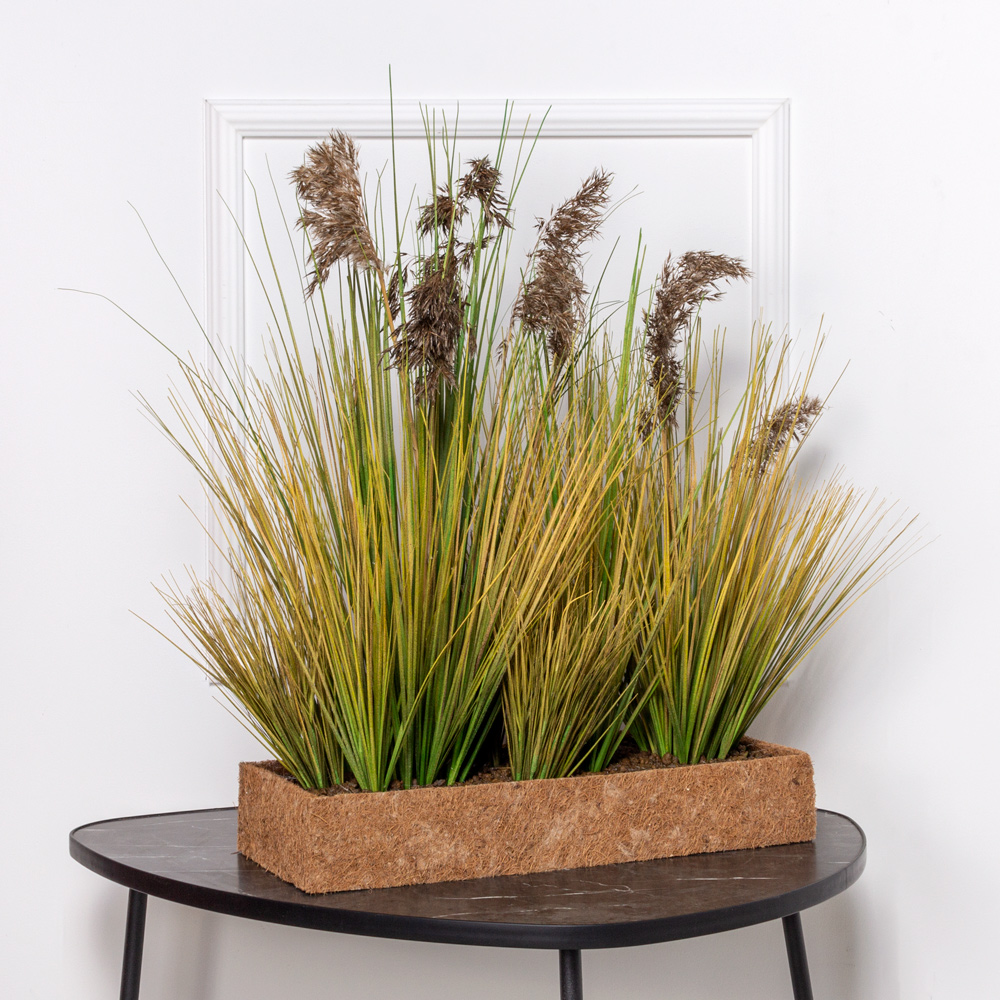 ТД097-6/2(з) Трава Осока искусственная с камышом h70см в кокосовом боксе 50х20х8см