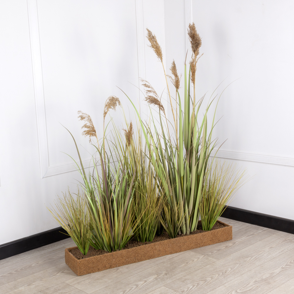 ТД097-6(з) Трава Осока искусственная с камышом в кокосовом боксе 95х20х8см, желто-зеленая