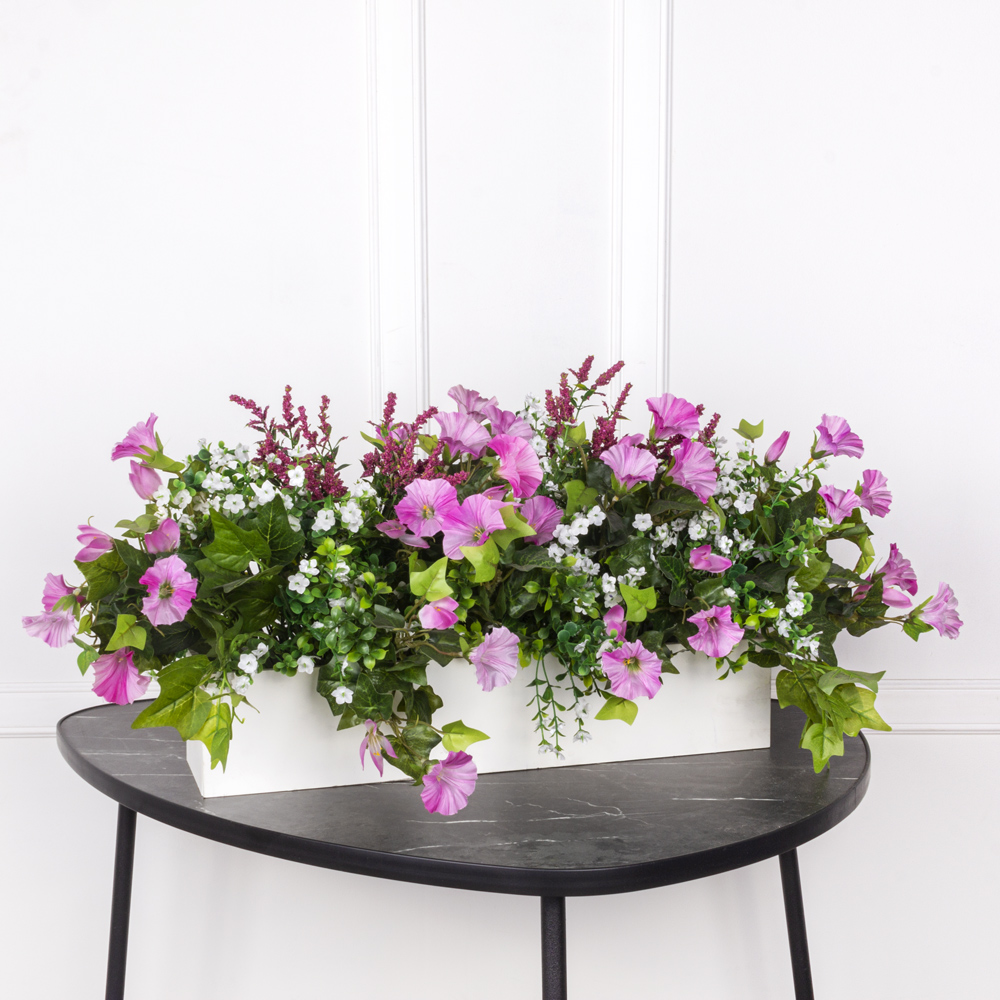 ТДЯ161 Композиция искусственная с петунией в деревянном ящике 50х12х10см, розовая