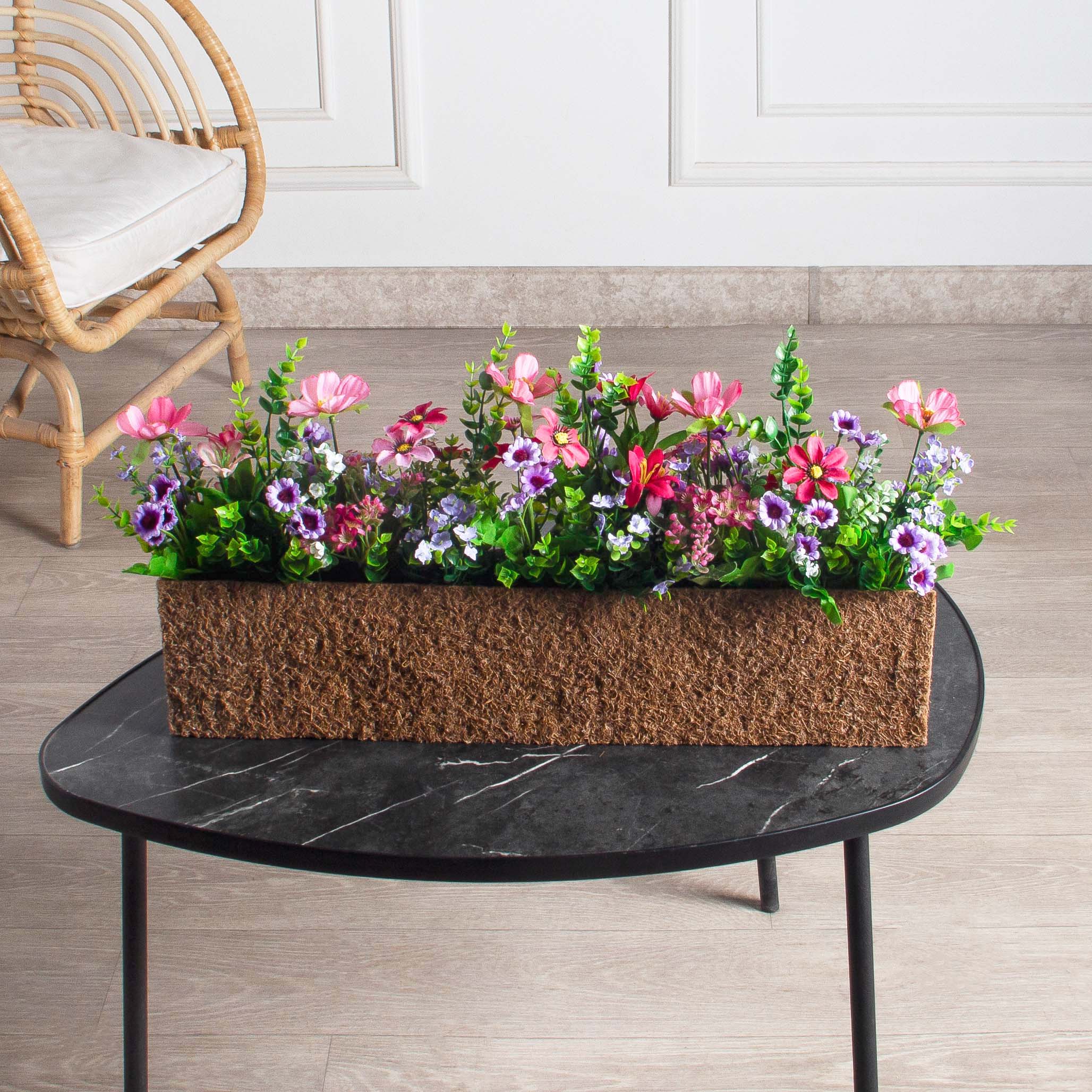 Ц427-1/3(з) Композиция искусственная Цветочный микс с колокольчиками(малиновыми) в кокосовом боксе 55,5х7,5х12см