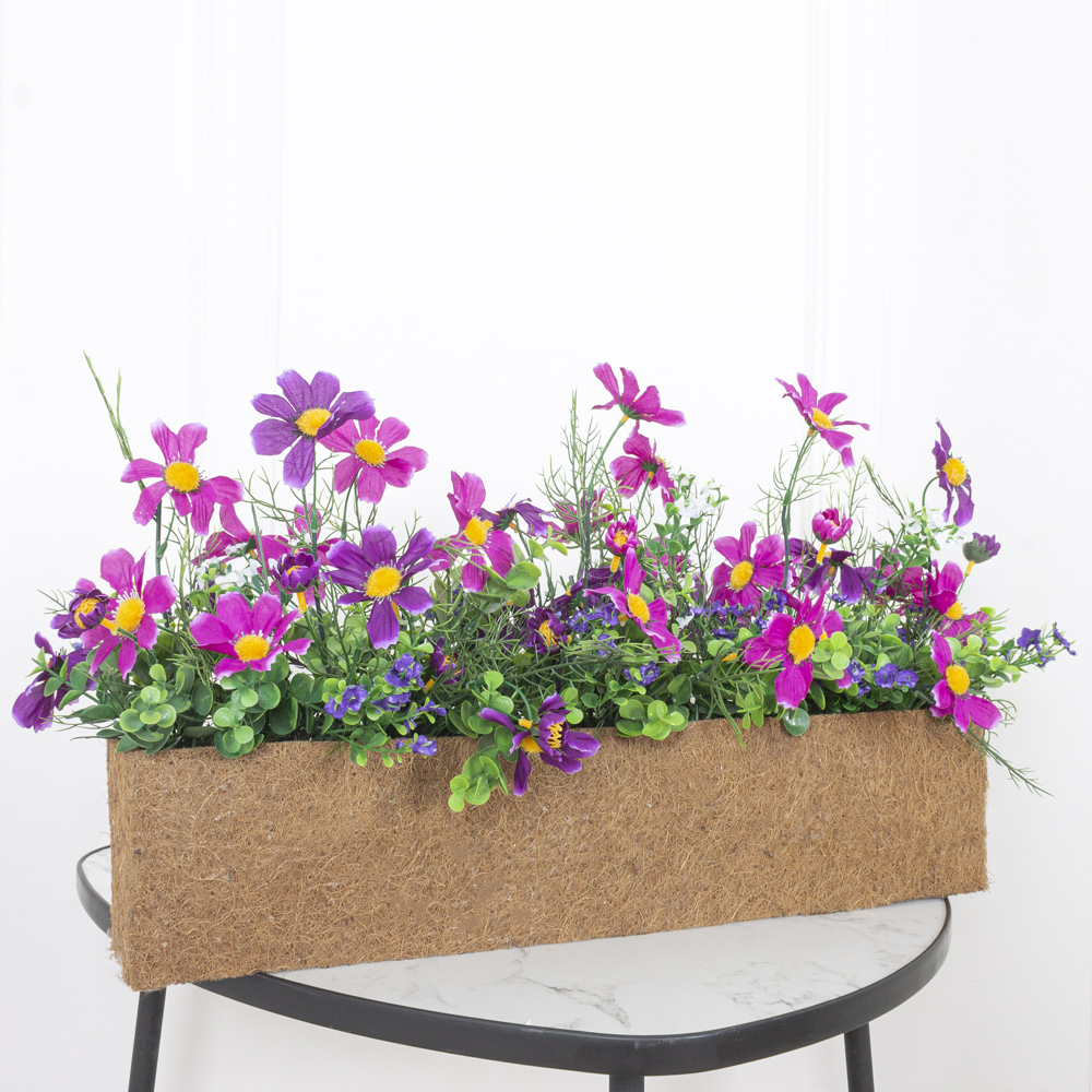 Ц427(з) Композиция искусственная Космея цветная в кокосовом боксе 55,5х7,5х12см