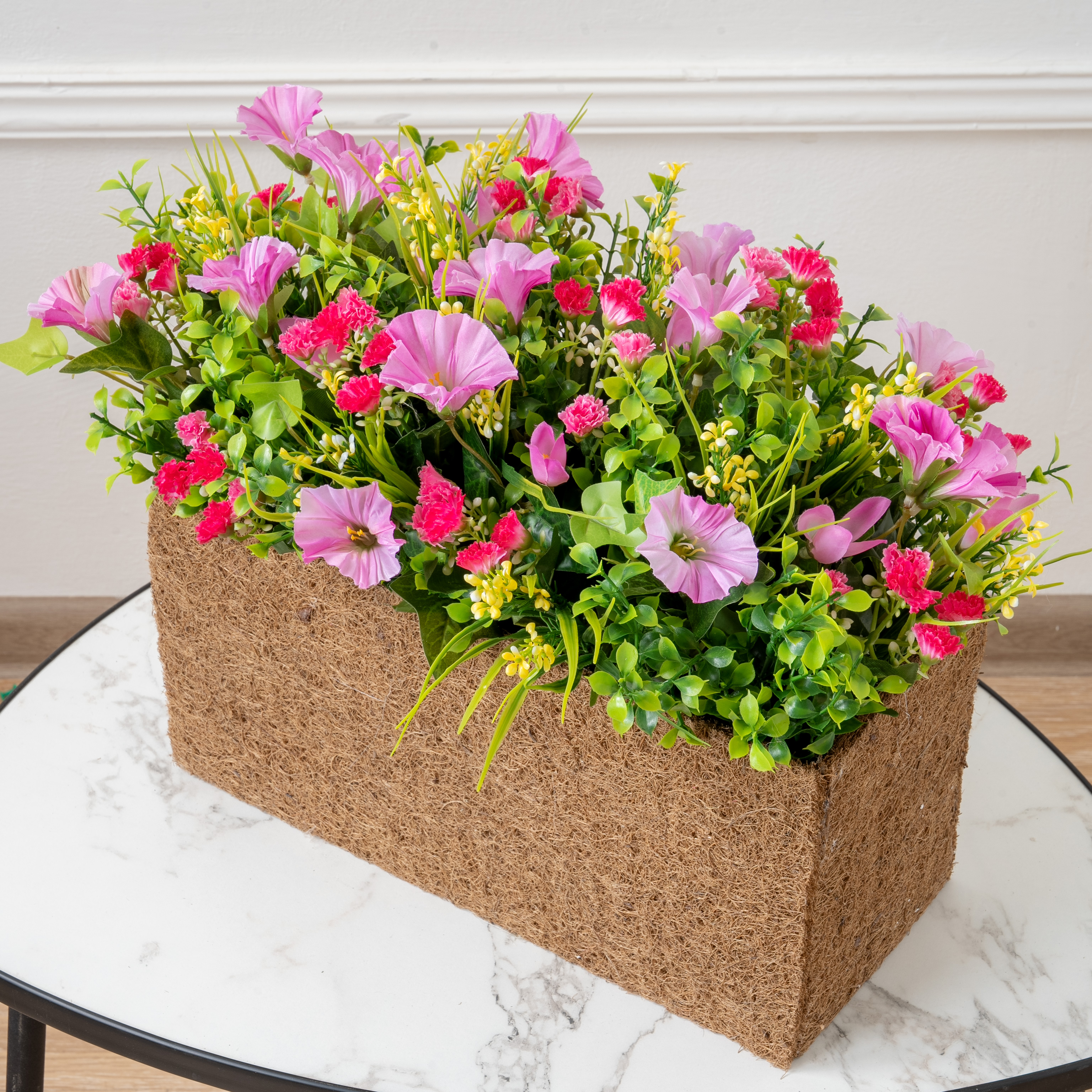 Ц602-4(з)(F) Композиция искусственная Петуния розовая в кокосовом боксе 35х15х17см