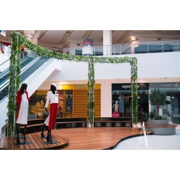 Для оформления арки в торговом центре Гранд Хаус были использованы самшит даксин ампелный и аспарагус ампельный. Уборные украшены папоротником в кокосовом боксе, а рядом со входом расположилась фитостена. Также по всему торговому комплексу расставлены такие растения в кашпо как оливковое дерево, агава гигант и олива искусственная.