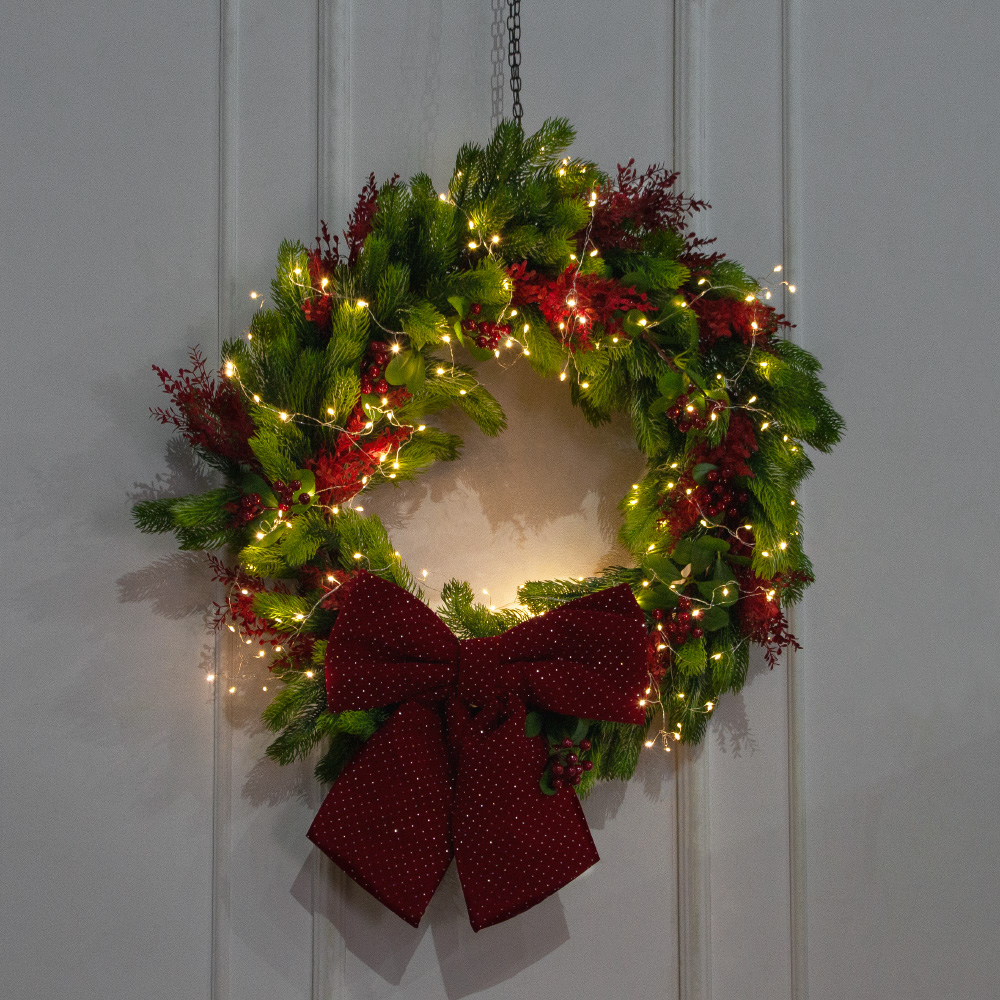 ВН15/СВ03т-2(Пр)(F) Венок искусственный НГ d70см, с красным декором и гирляндой Роса