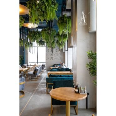 В лаундж рестобаре Veches было проведено комплексное озеленение искусственными растениями - они всегда свежие и не требуют услуги по уходу опытными специалистами. Потолочные композиции состоят из лиан с адиантумом, даксина, сциндапсуса, филодендрона, крассулы мшистой, хедеры, плюща, мюленбекии ампельной и виноградного плюща . А индивидуальный столик "место побыть одному" отделен шпалерой с шеффлерой. А по всему залу расставлены деревья и кусты: шеффлера, олива, фикус, фикус эластика, мини-пальма.